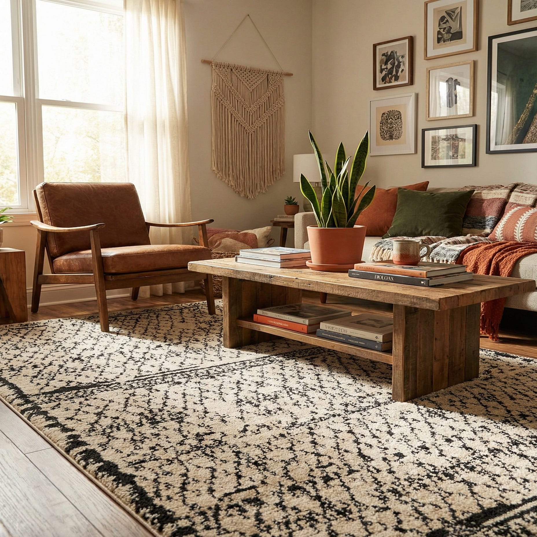 Primary color is Ivory. Colors in this rug include: Ivory, Black.
