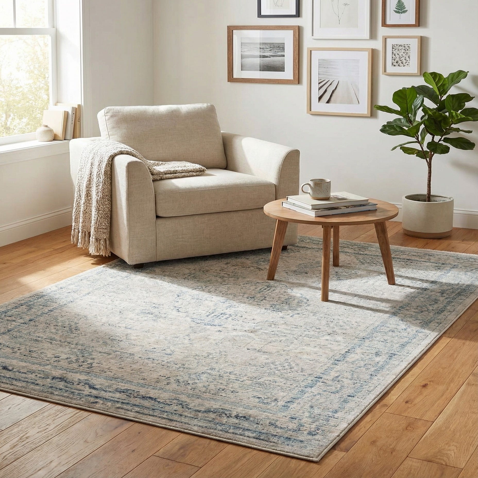 Primary color is Ivory. Colors in this rug include: Ivory, Gray, Navy Blue, Beige, Light Blue.