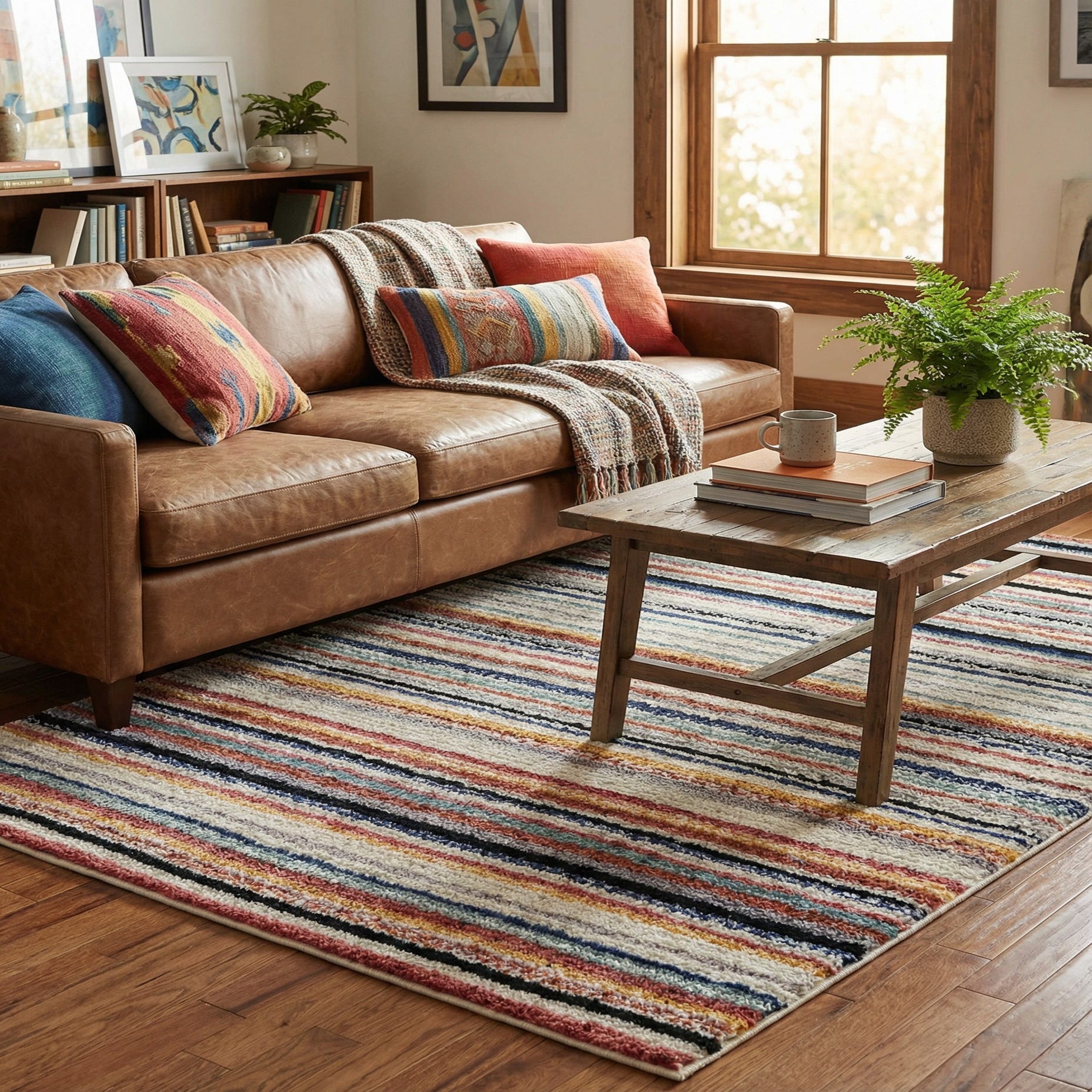 Primary color is Ivory. Colors in this rug include: Ivory, Black, Blue, Gray, Light Blue, Light Green, Navy Blue, Yellow, Pink, Peach.