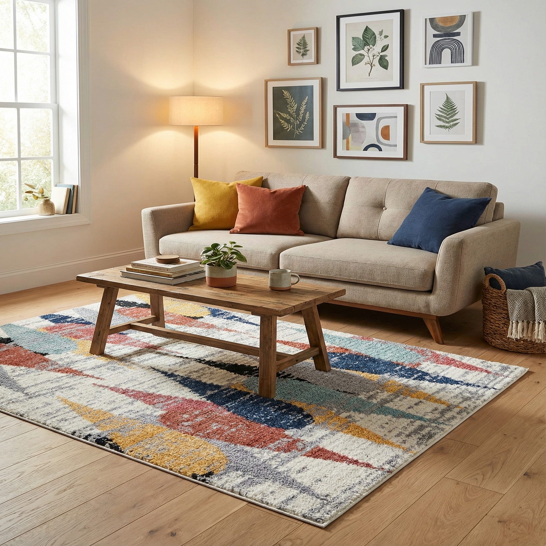 Primary color is Ivory. Colors in this rug include: Ivory, Black, Gray, Light Blue, Navy Blue, Orange, Rust Red.