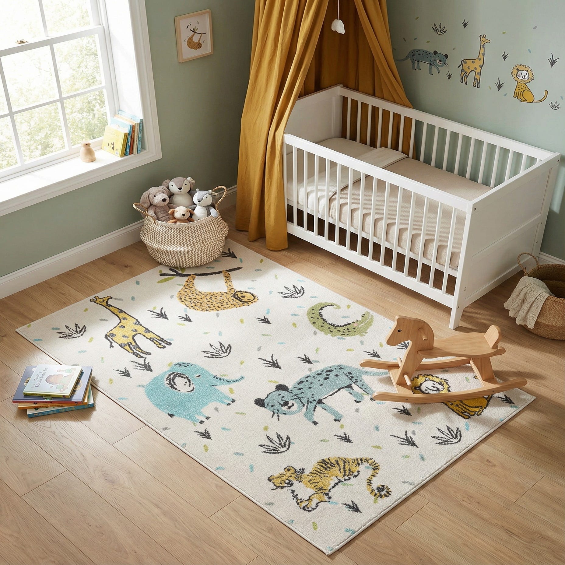 Primary color is Ivory. Colors in this rug include: Ivory, Black, Green, Light Blue, Yellow, Gray.