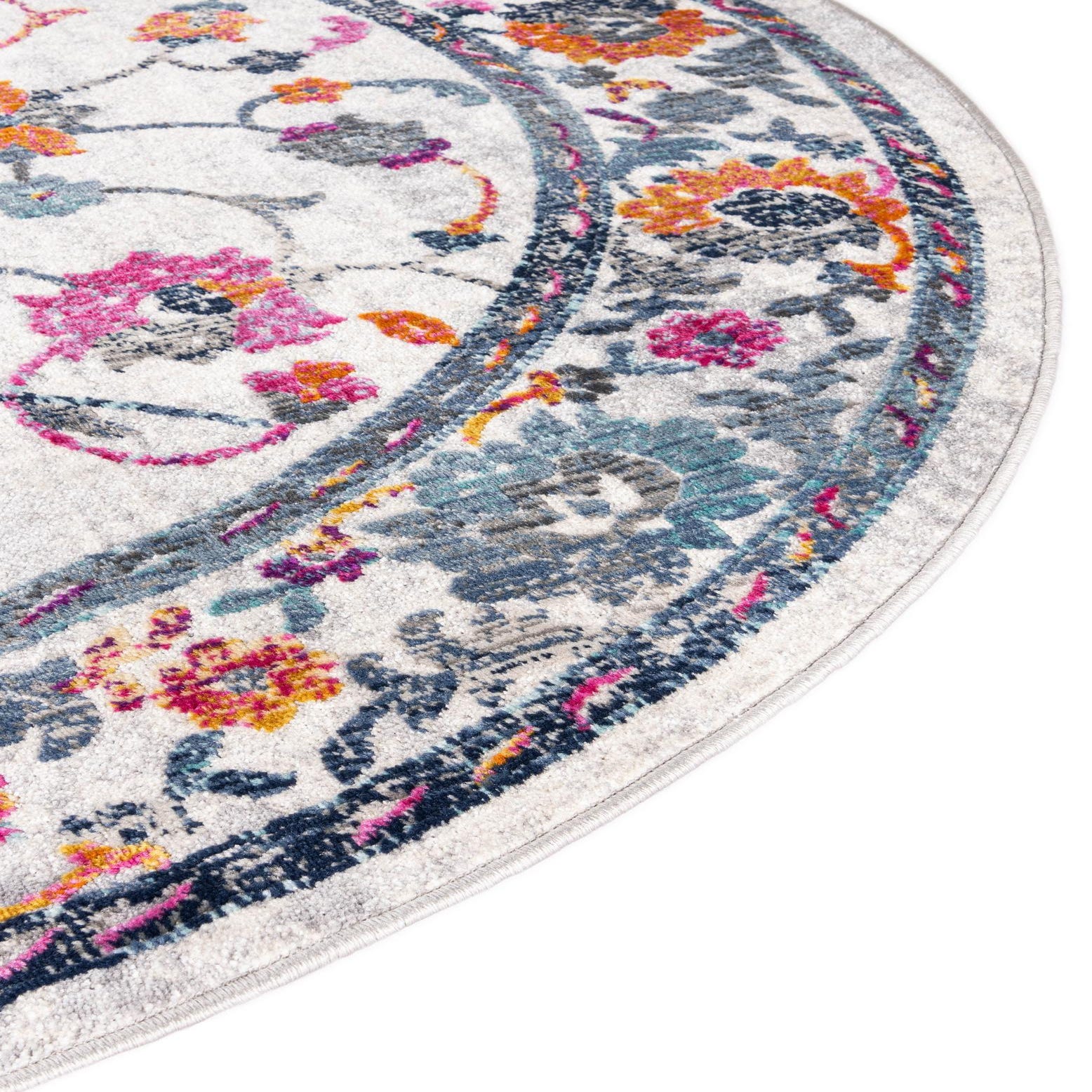 Primary color is Ivory. Colors in this rug include: Ivory, Blue, Gray, Orange, Pink, Purple, Navy Blue.