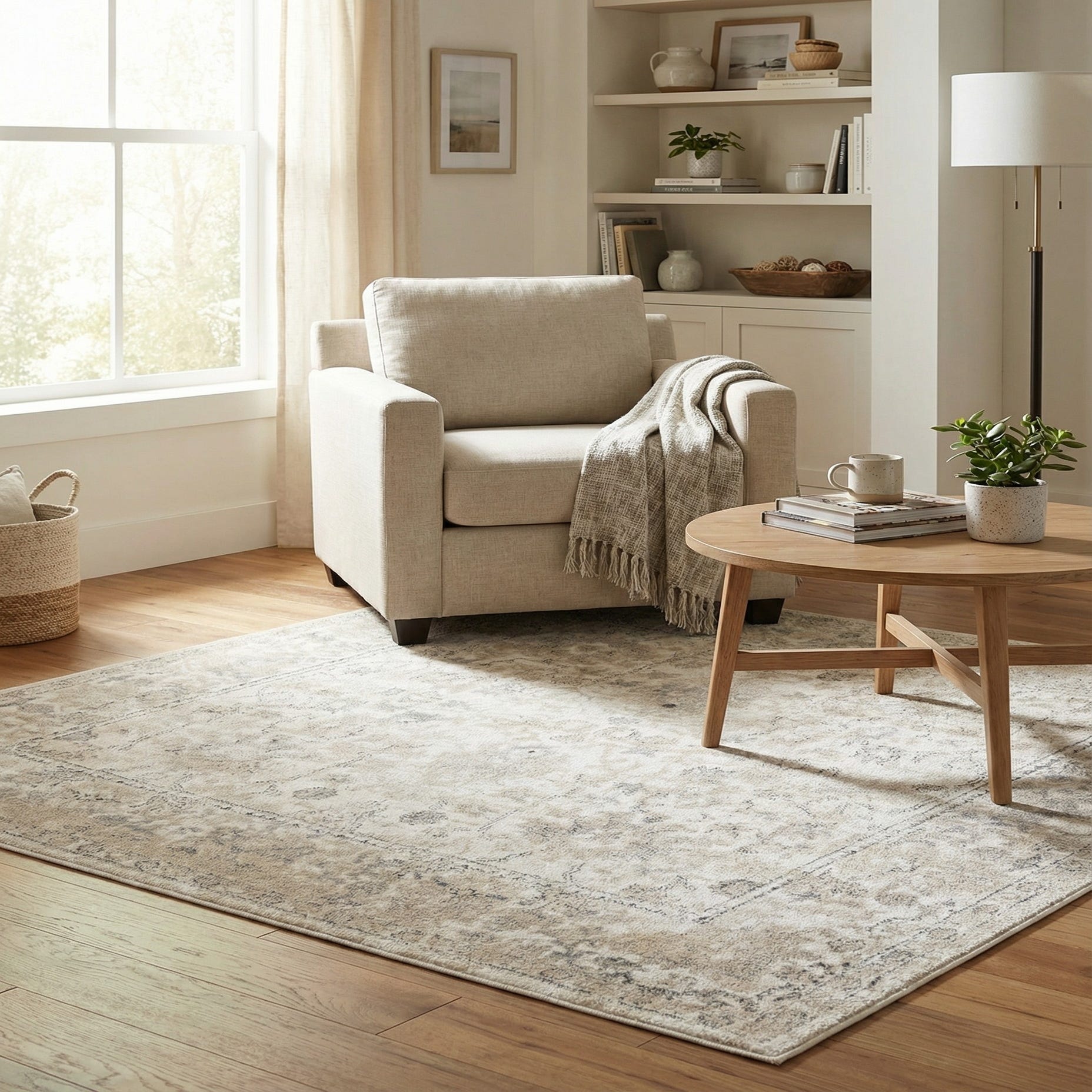 Primary color is Ivory. Colors in this rug include: Ivory, Beige, Gray, Tan.
