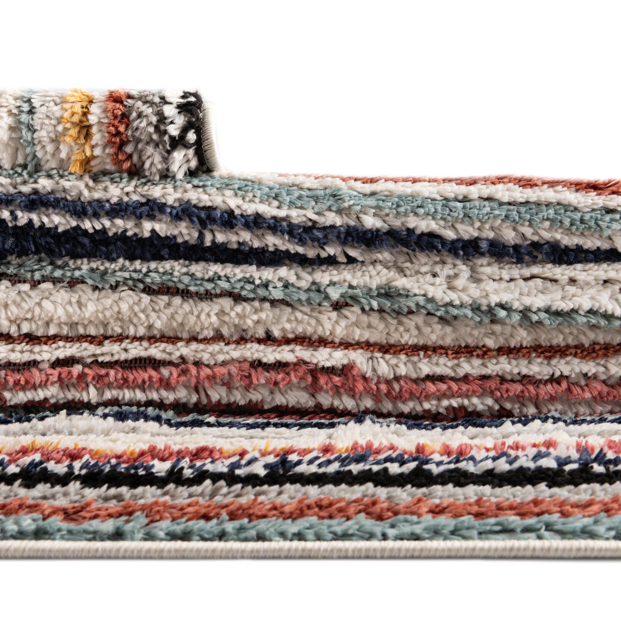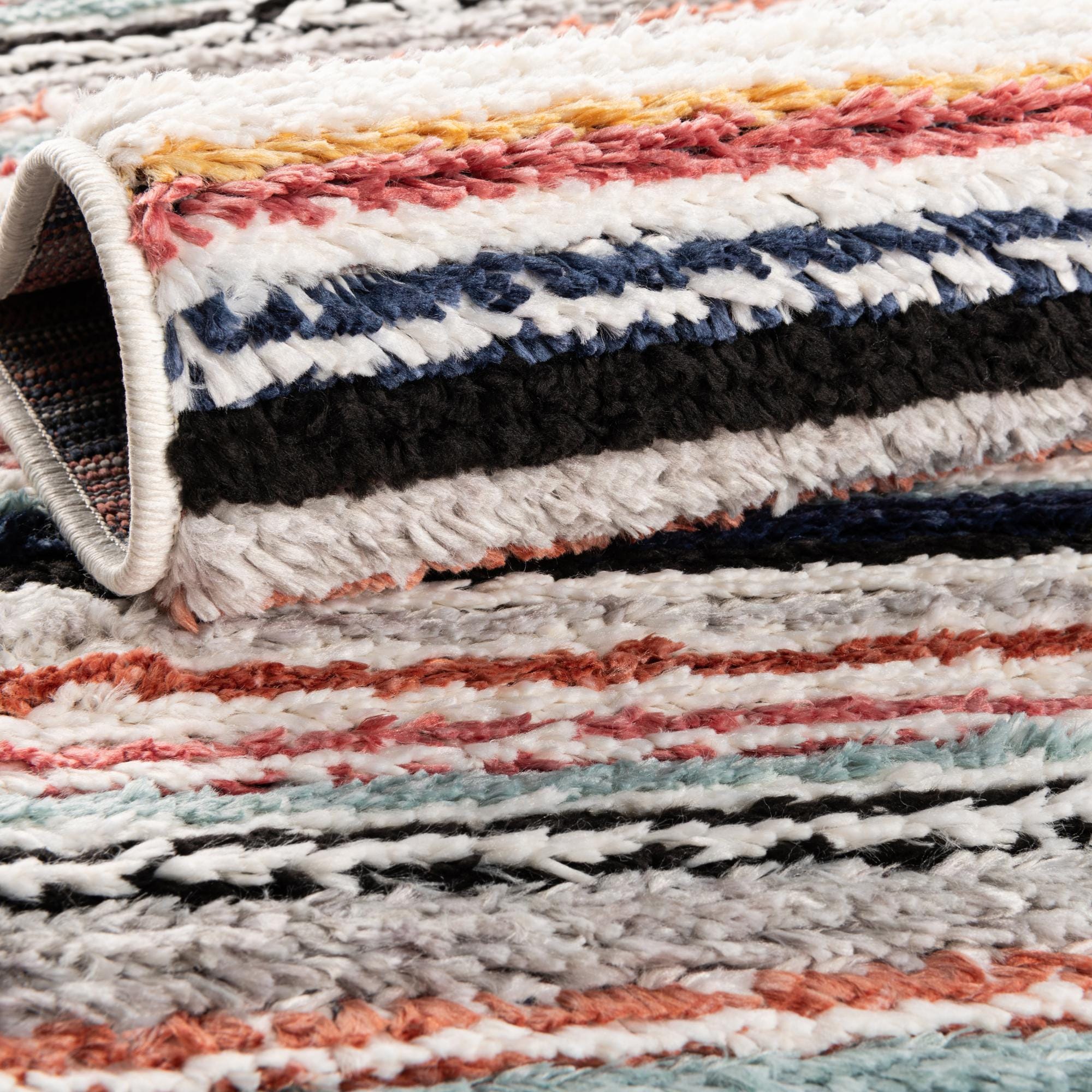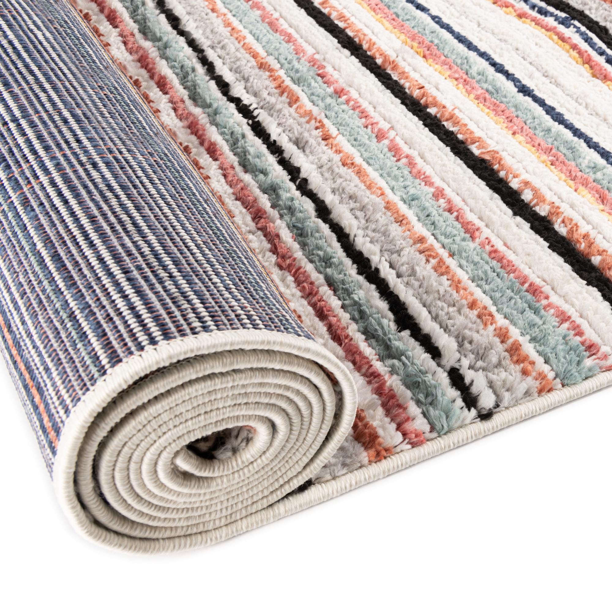 Primary color is Ivory. Colors in this rug include: Ivory, Black, Blue, Gray, Light Blue, Light Green, Peach, Yellow, Pink, Navy Blue.