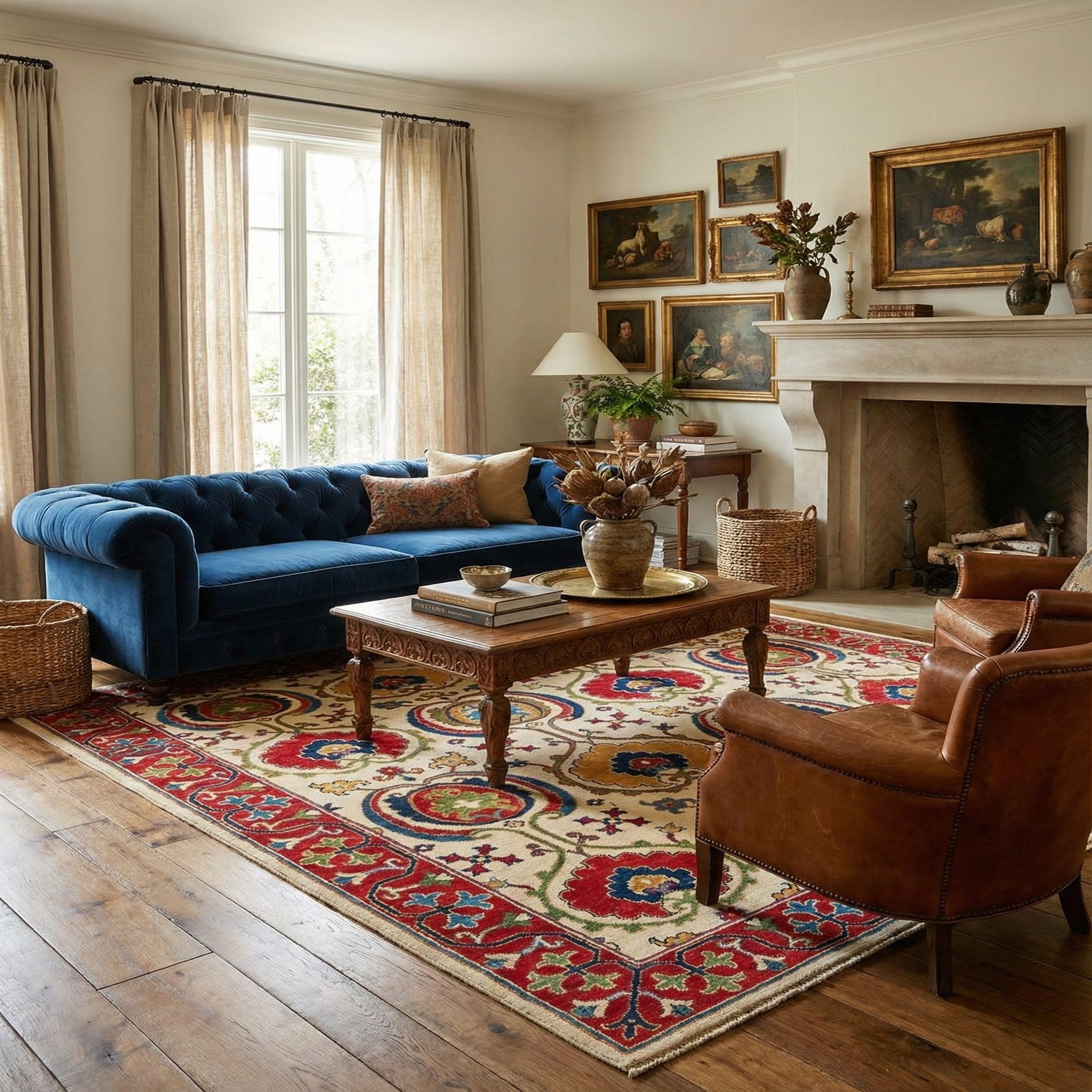 Primary color is Ivory. Colors in this rug include: Ivory, Green, Navy Blue, Yellow, Red.