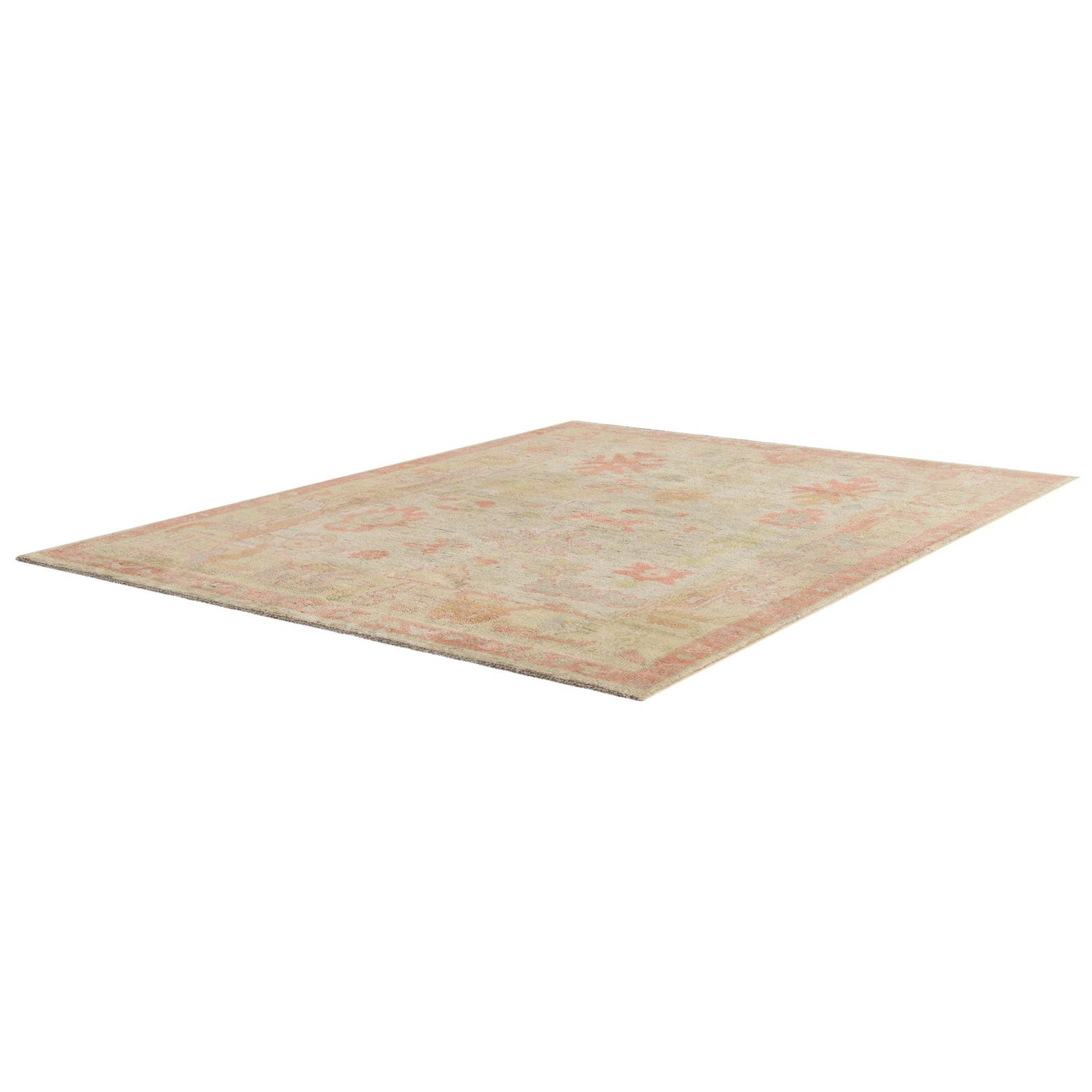 Primary color is Ivory. Colors in this rug include: Ivory, Pink, Green, Gray, Brown.
