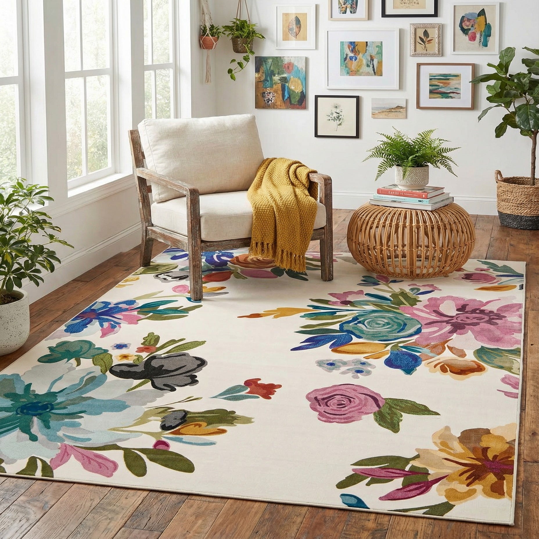 Primary color is Ivory. Colors in this rug include: Ivory, Black, Blue, Gray, Light Blue, Olive, Pink, Purple, Yellow.