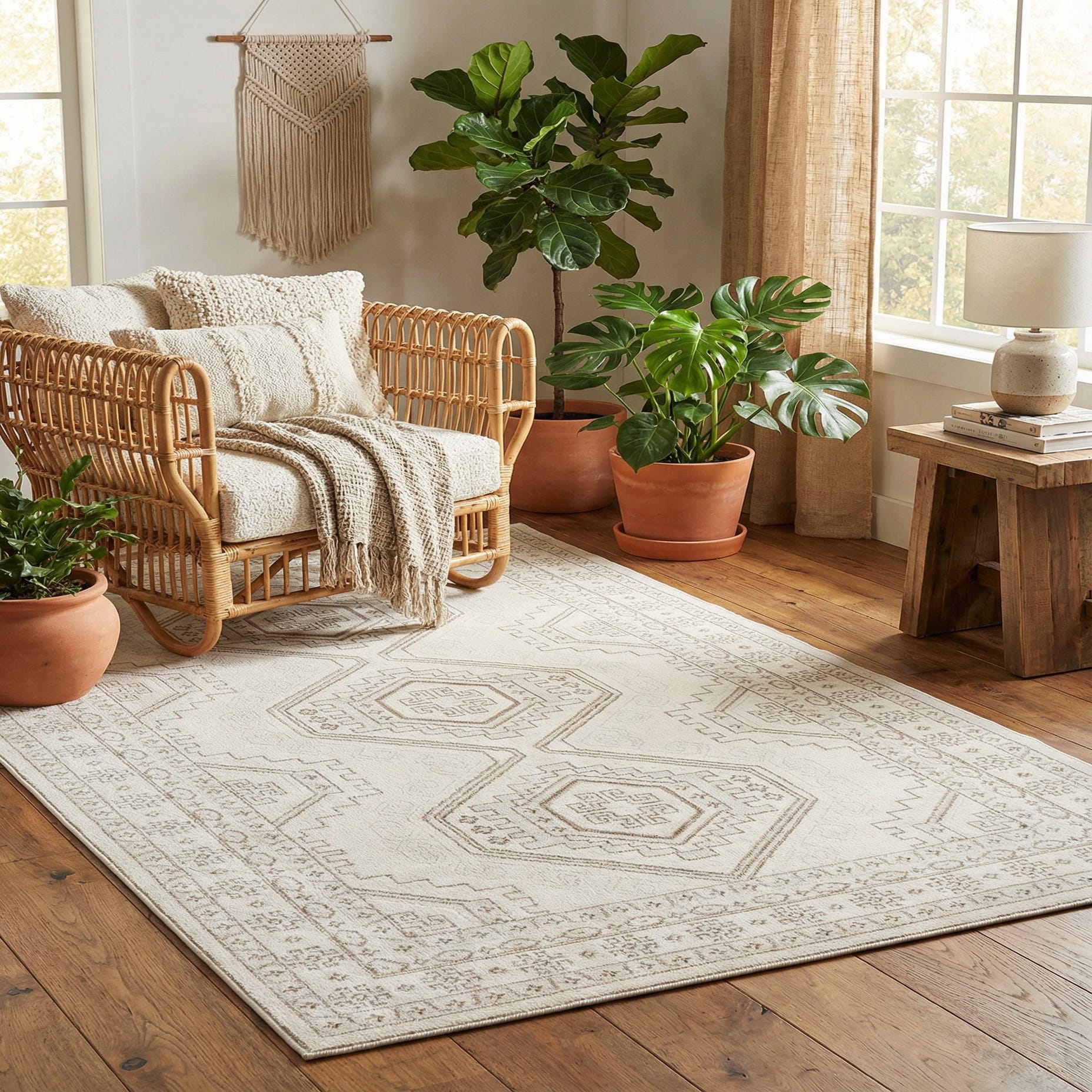Primary color is Ivory. Colors in this rug include: Ivory, Gray, Light Brown.