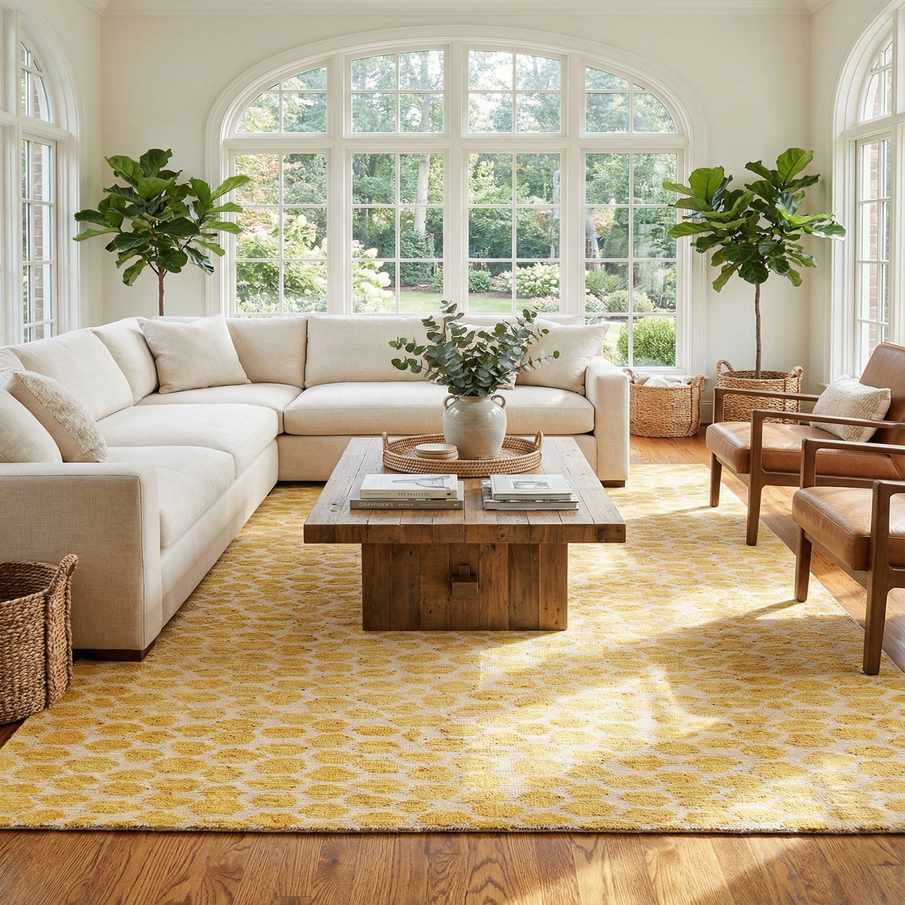 Primary color is Ivory. Colors in this rug include: Ivory, Yellow.