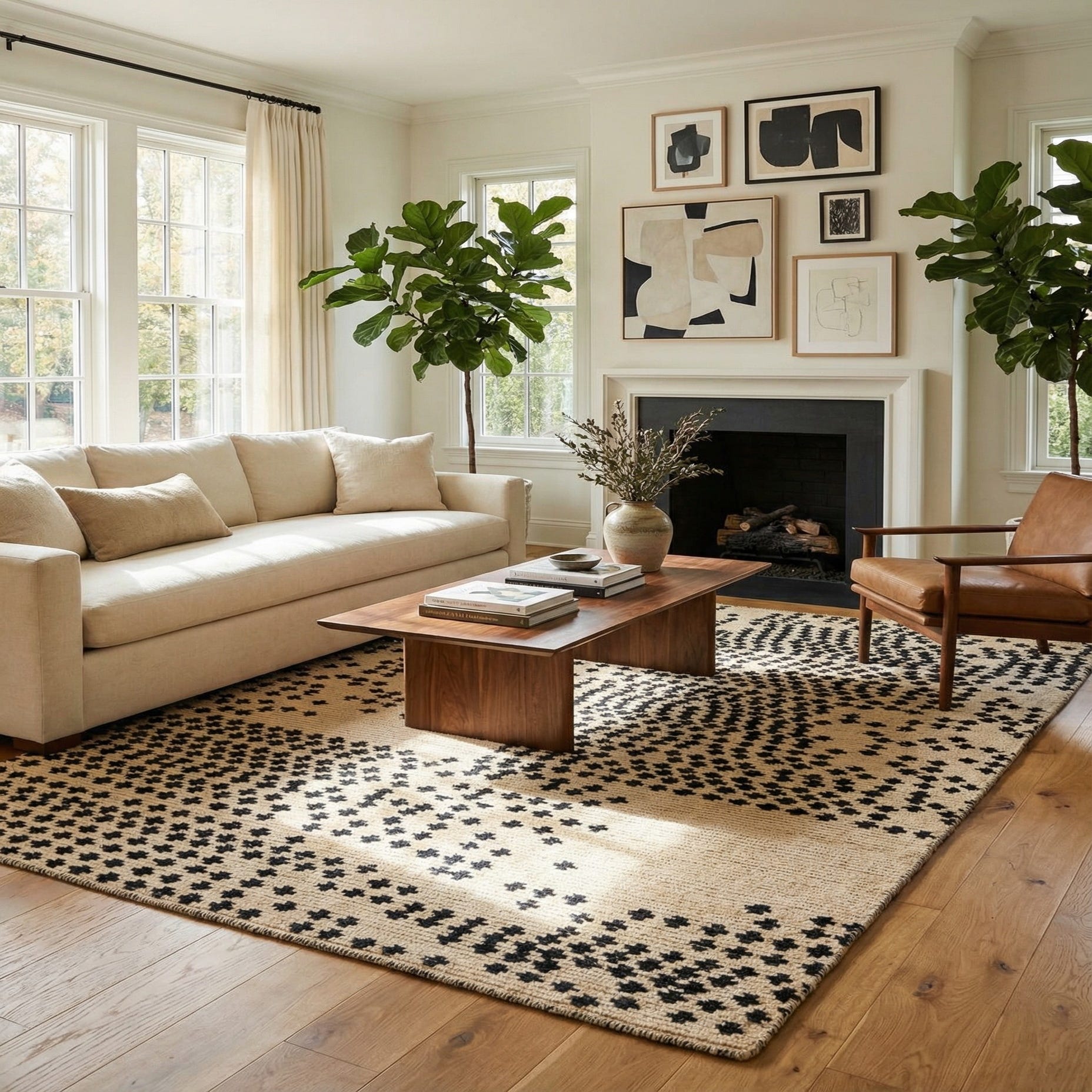 Primary color is Ivory. Colors in this rug include: Ivory, Black.