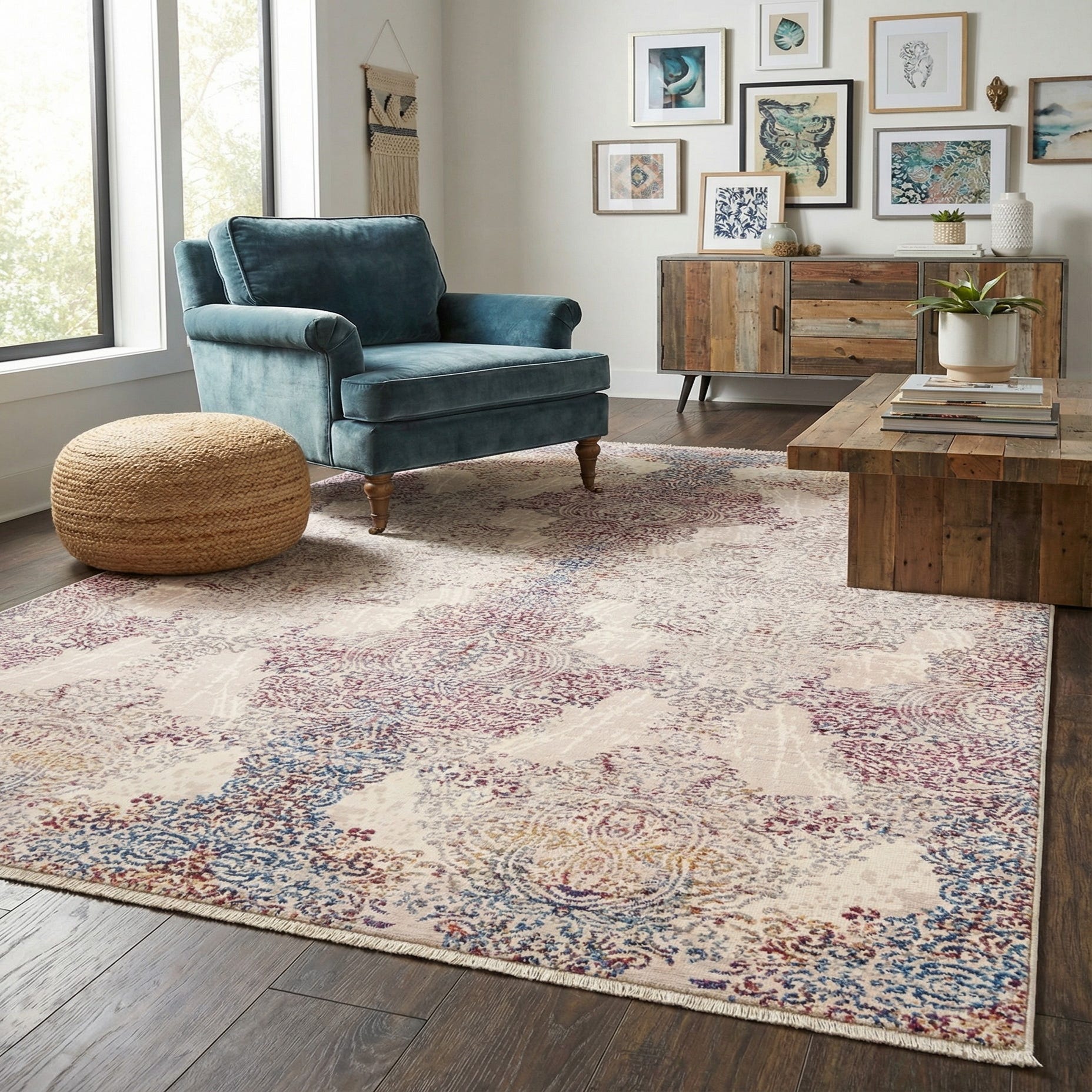 Primary color is Ivory. Colors in this rug include: Ivory, Blue, Gold, Purple, Light Blue.