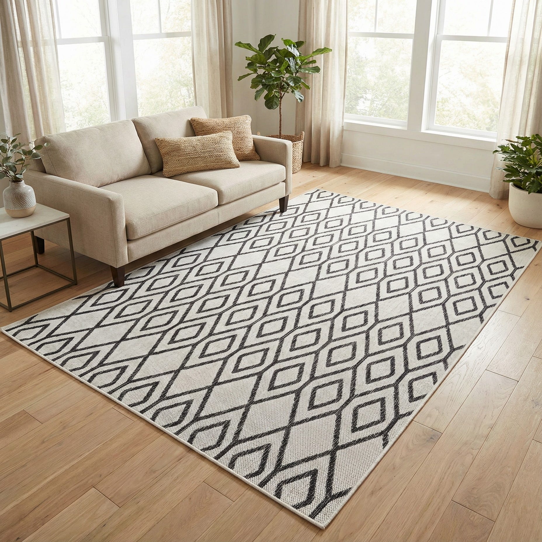 Primary color is Ivory. Colors in this rug include: Ivory, Black.