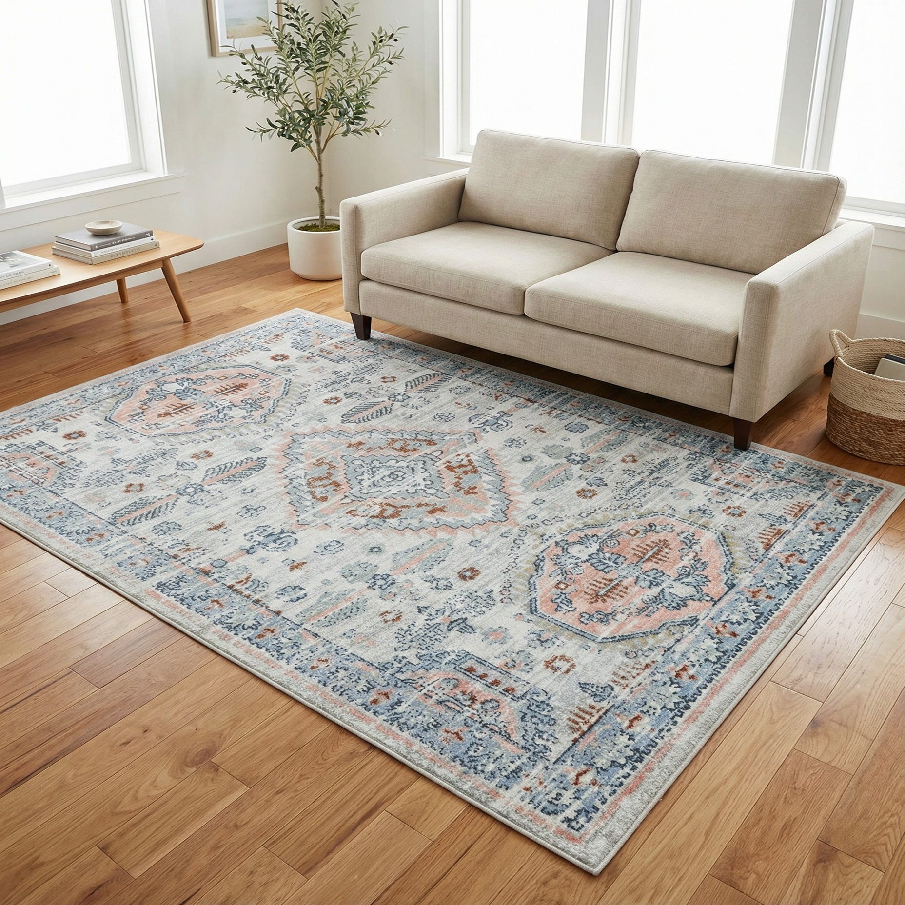 Primary color is Ivory. Colors in this rug include: Ivory, Gray, Light Blue, Rust Red, Navy Blue, Pink.