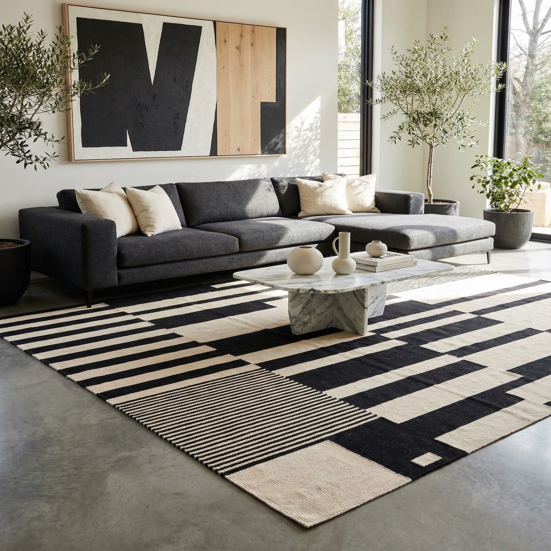 Primary color is Ivory. Colors in this rug include: Ivory, Black.