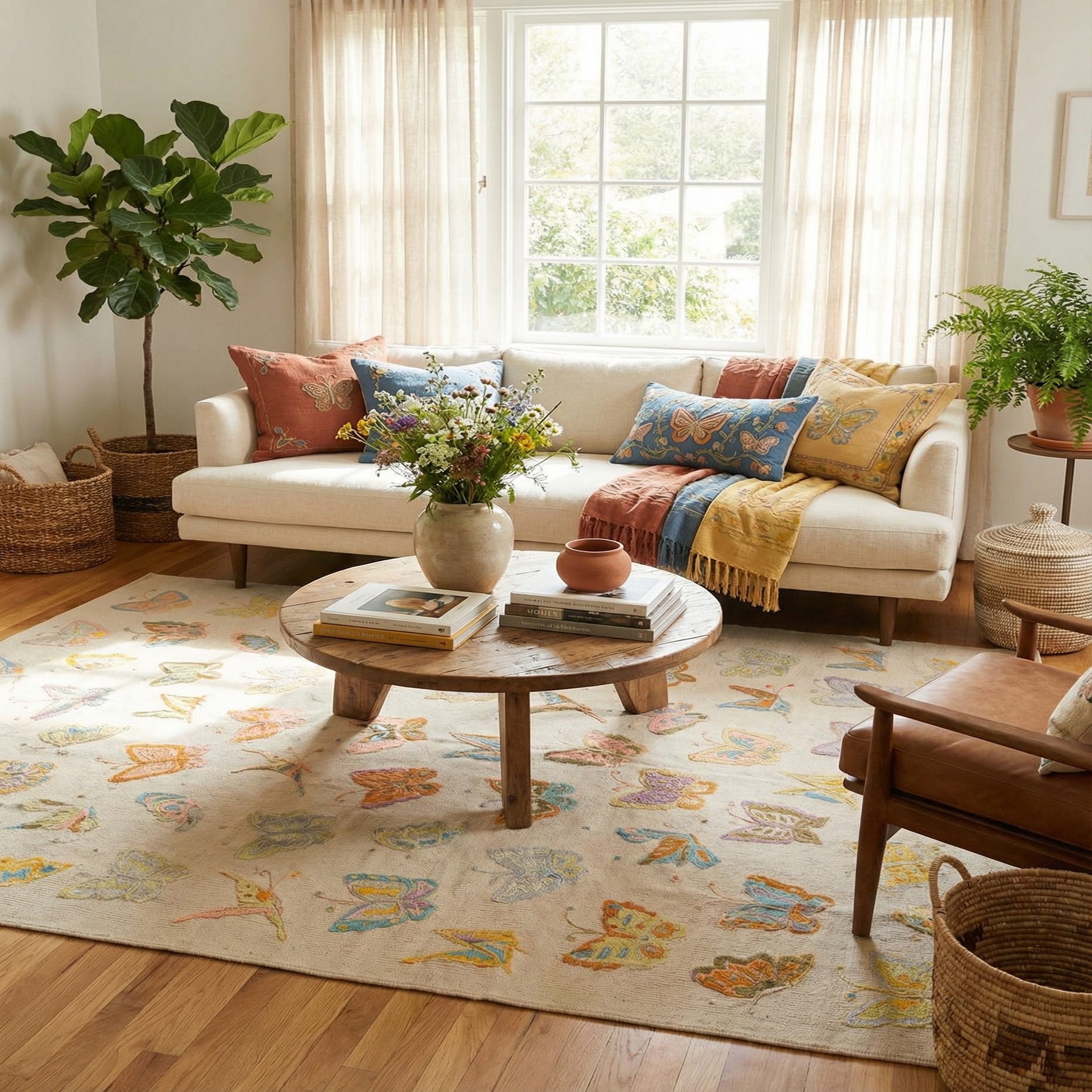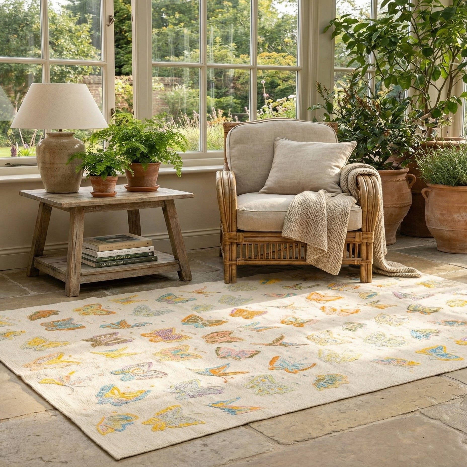 Primary color is Ivory. Colors in this rug include: Ivory, Beige, Blue, Brown, Olive, Light Blue, Light Brown, Light Green, Light Salmon, Gold, Gray, Green, Peach.