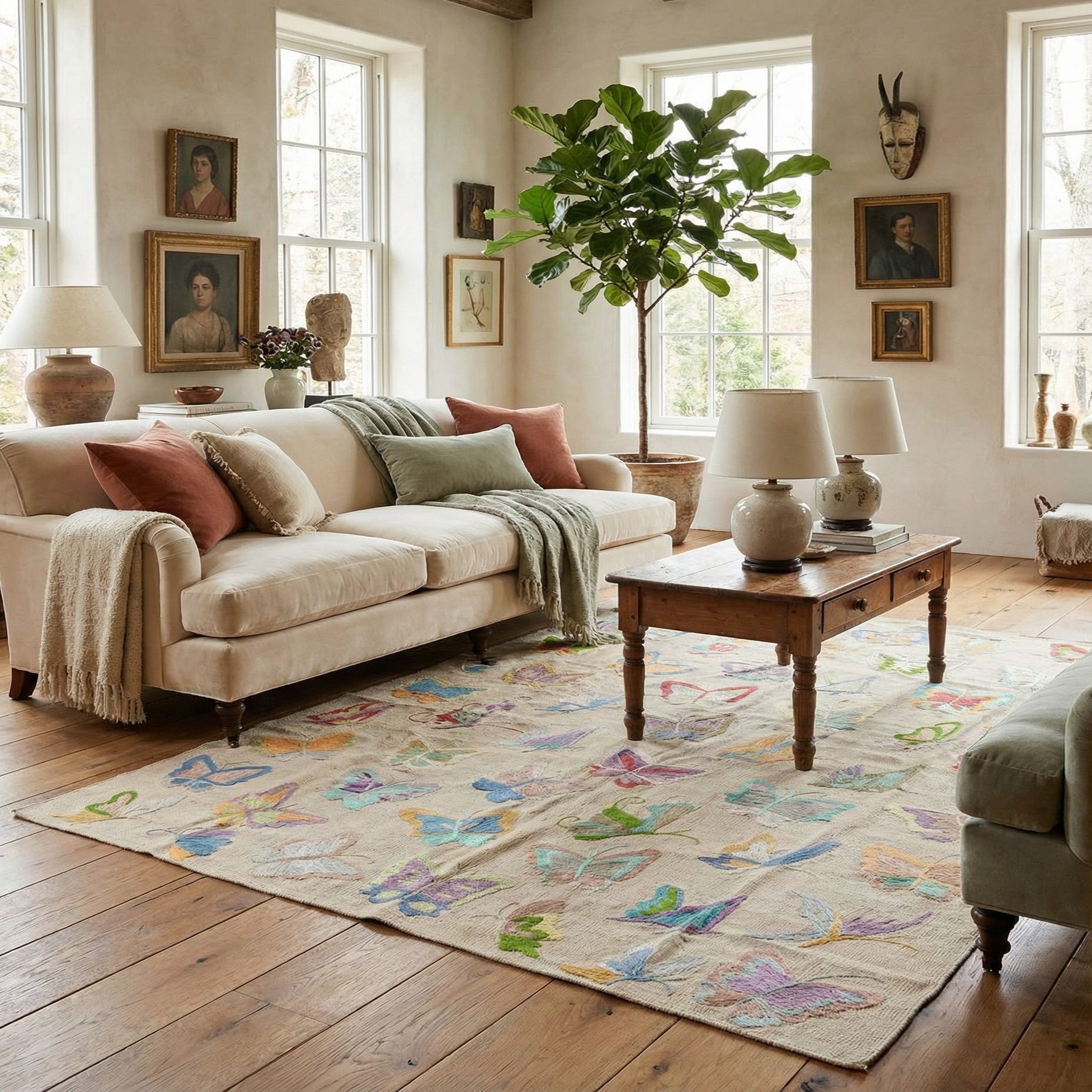 Primary color is Ivory. Colors in this rug include: Ivory, Brown, Light Blue, Light Green, Olive, Orange, Red, Violet.
