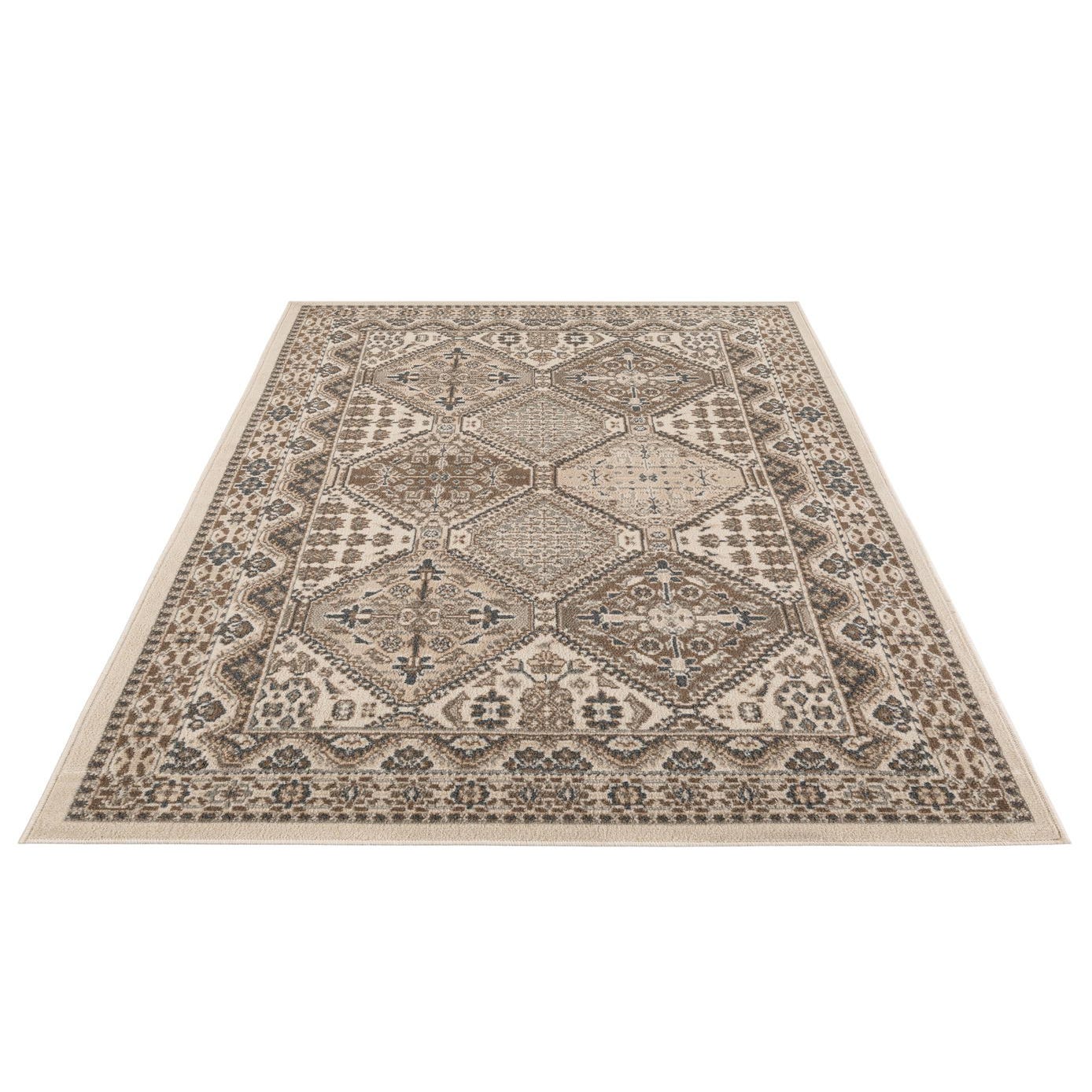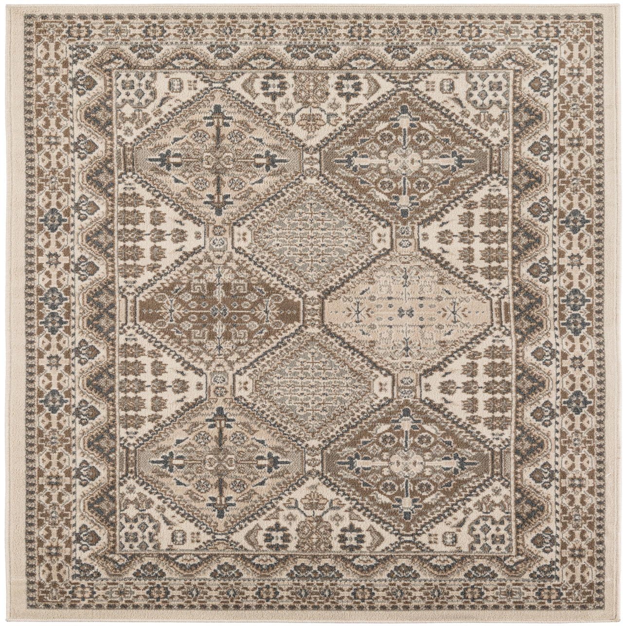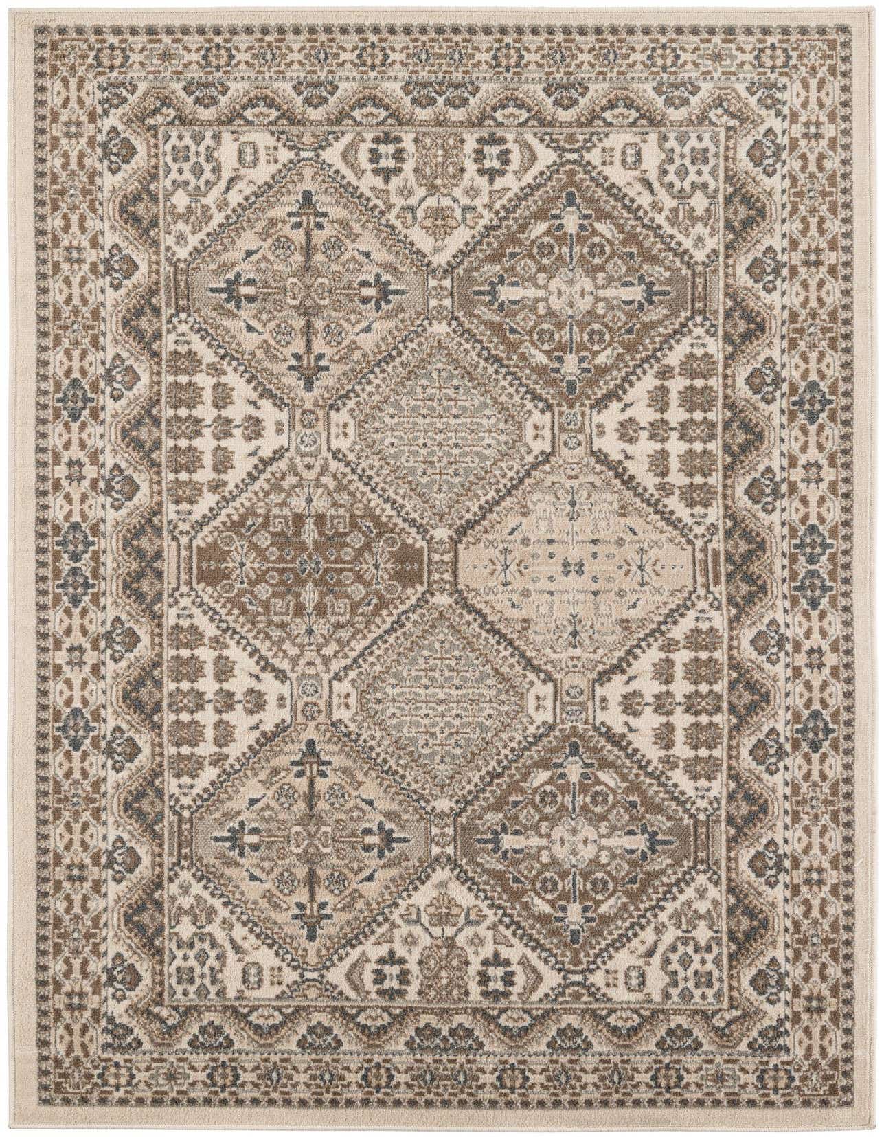 Primary color is Ivory. Colors in this rug include: Ivory, Brown, Gray, Beige.