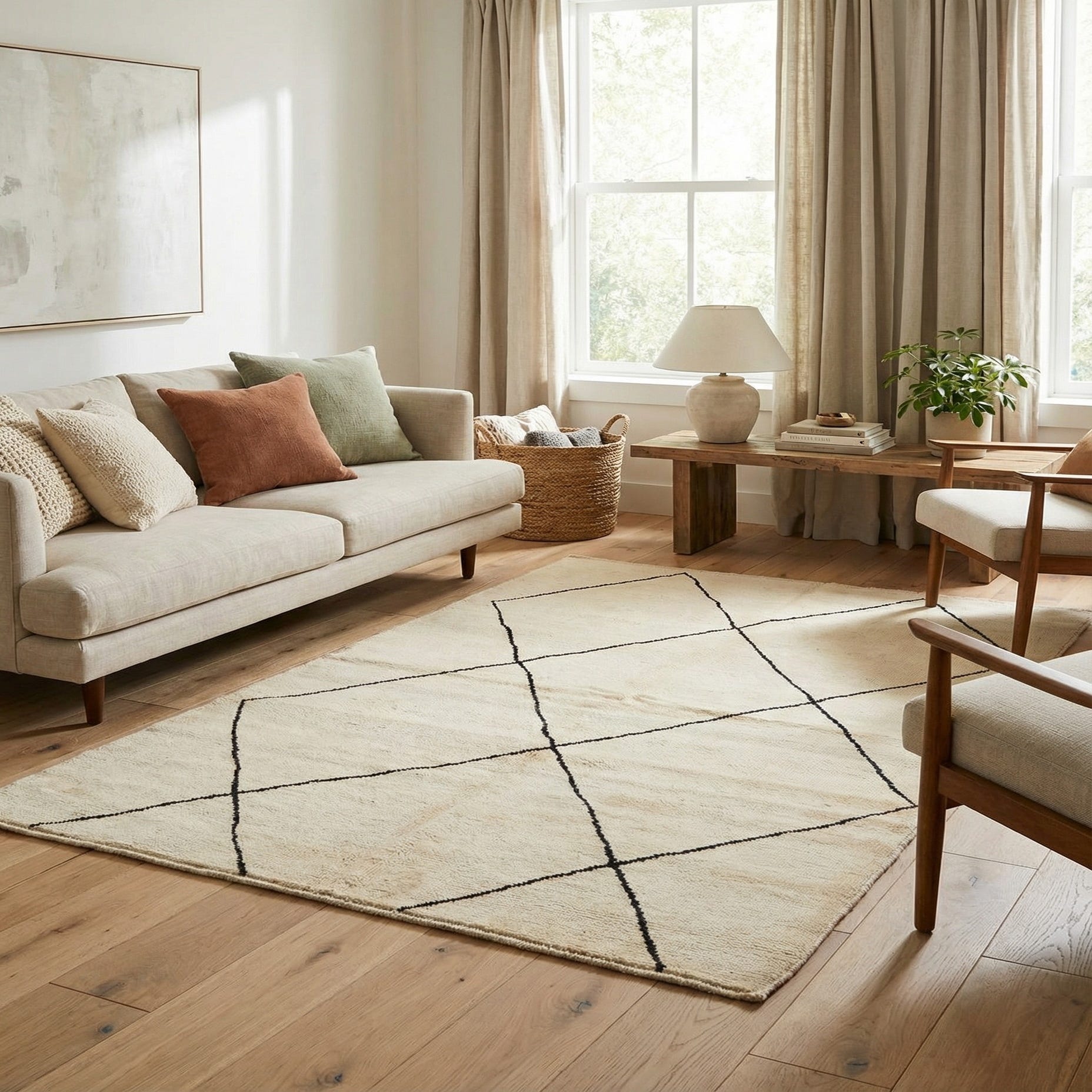 Primary color is Ivory. Colors in this rug include: Ivory, Black.