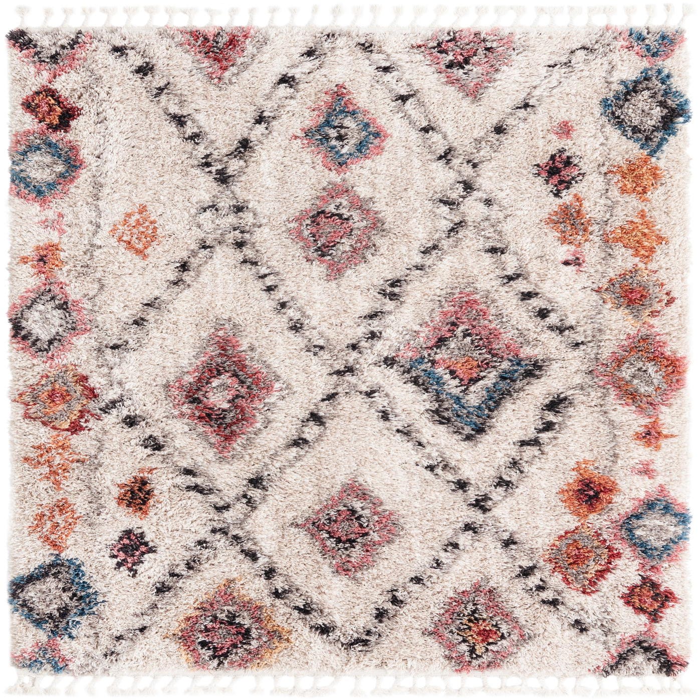 Primary color is Ivory. Colors in this rug include: Ivory, Black, Blue, Gray, Peach, Orange, Pink, Navy Blue.