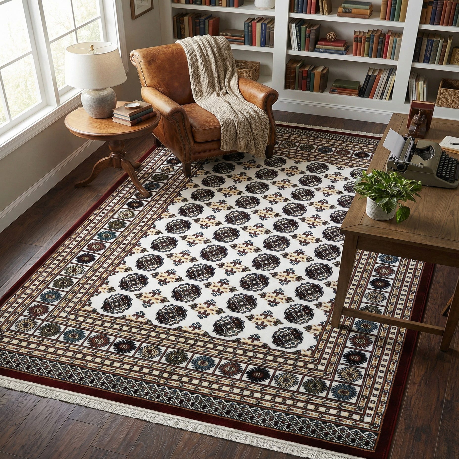 Primary color is Ivory. Colors in this rug include: Ivory, Blue, Red, Rust Red, Olive, Beige.