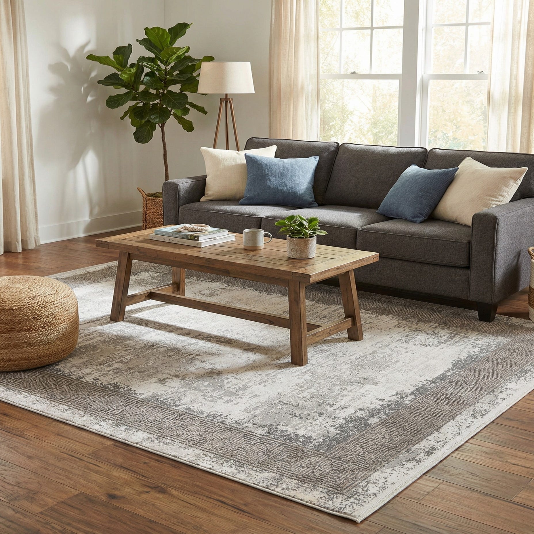 Primary color is Ivory. Colors in this rug include: Ivory, Gray.