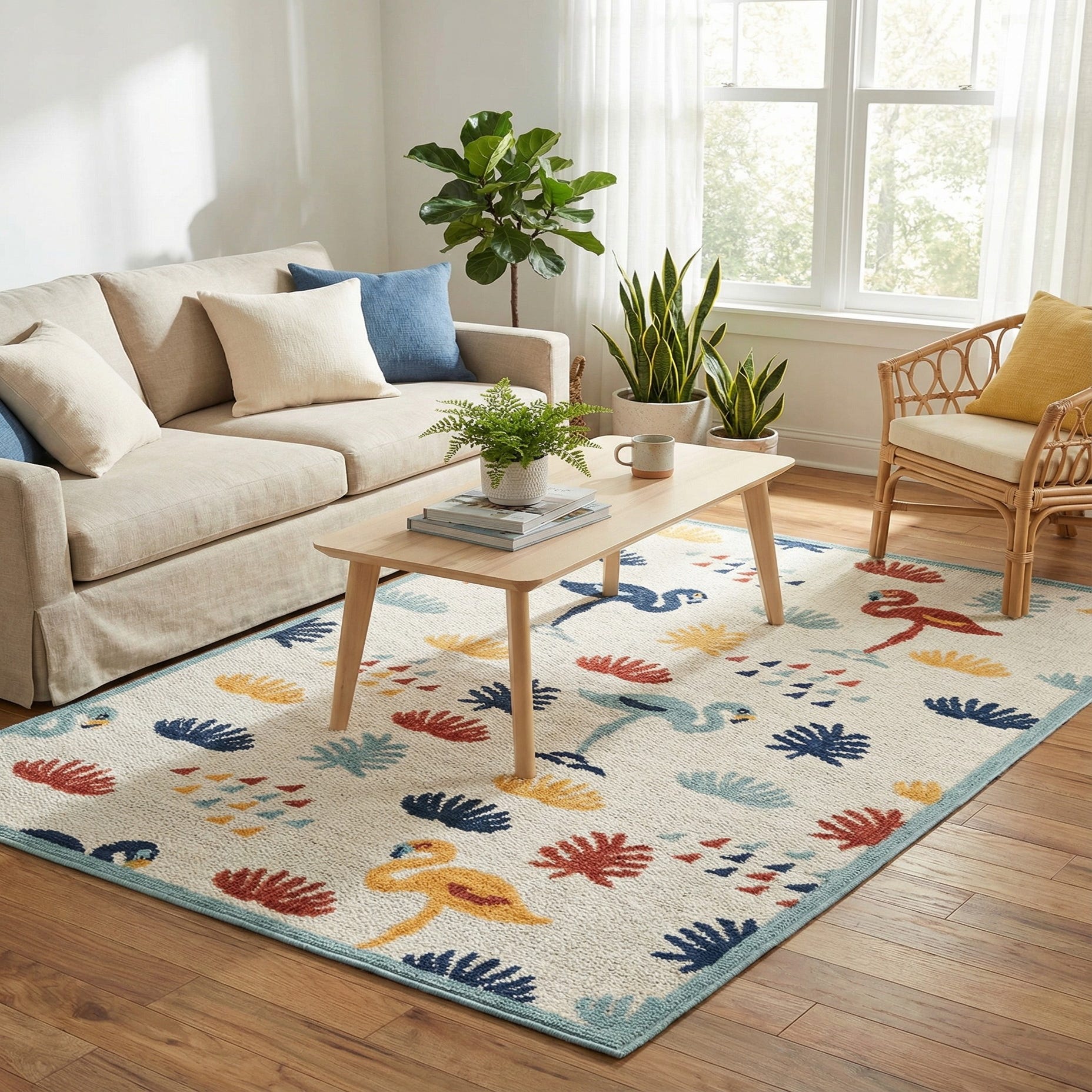 Primary color is Ivory. Colors in this rug include: Ivory, Light Blue, Navy Blue, Yellow, Terracotta.