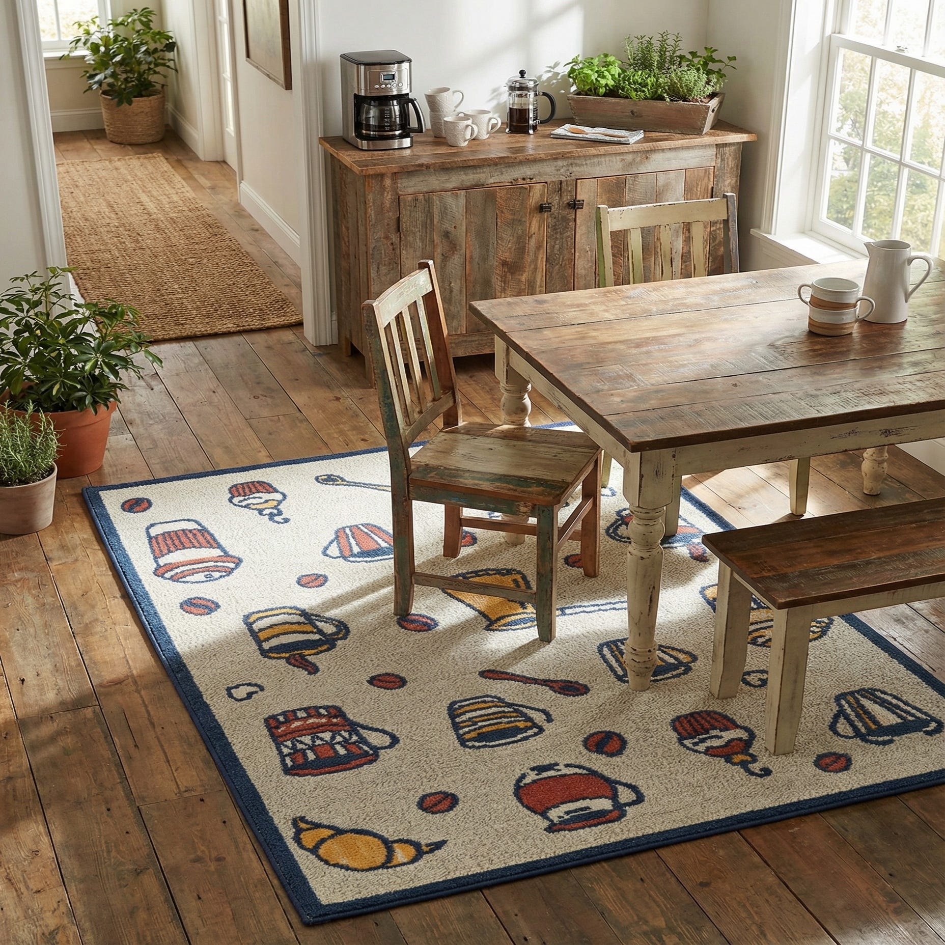 Primary color is Ivory. Colors in this rug include: Ivory, Navy Blue, Yellow, Rust Red.