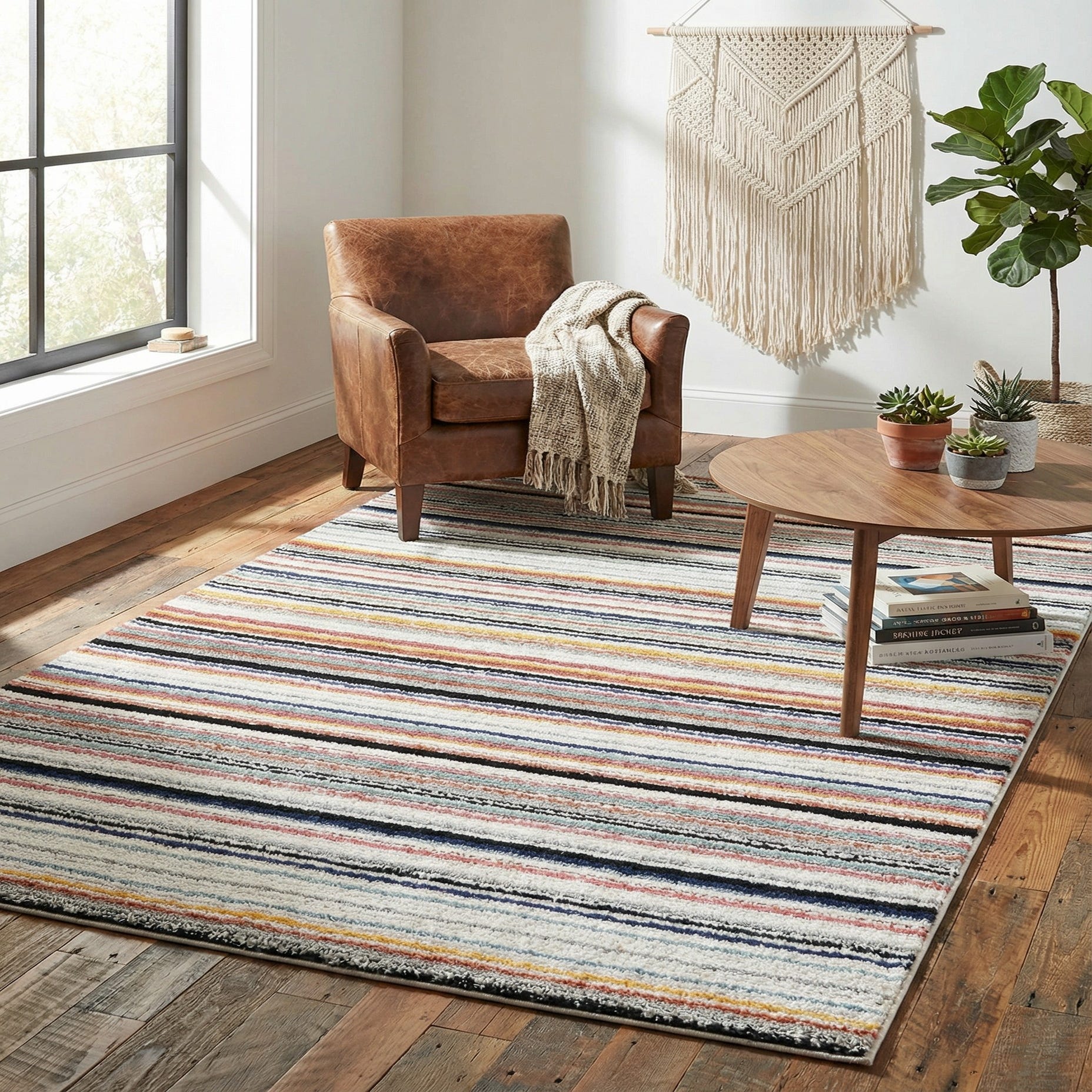 Primary color is Ivory. Colors in this rug include: Ivory, Black, Blue, Navy Blue, Peach, Yellow, Light Blue, Light Green, Gray, Pink.