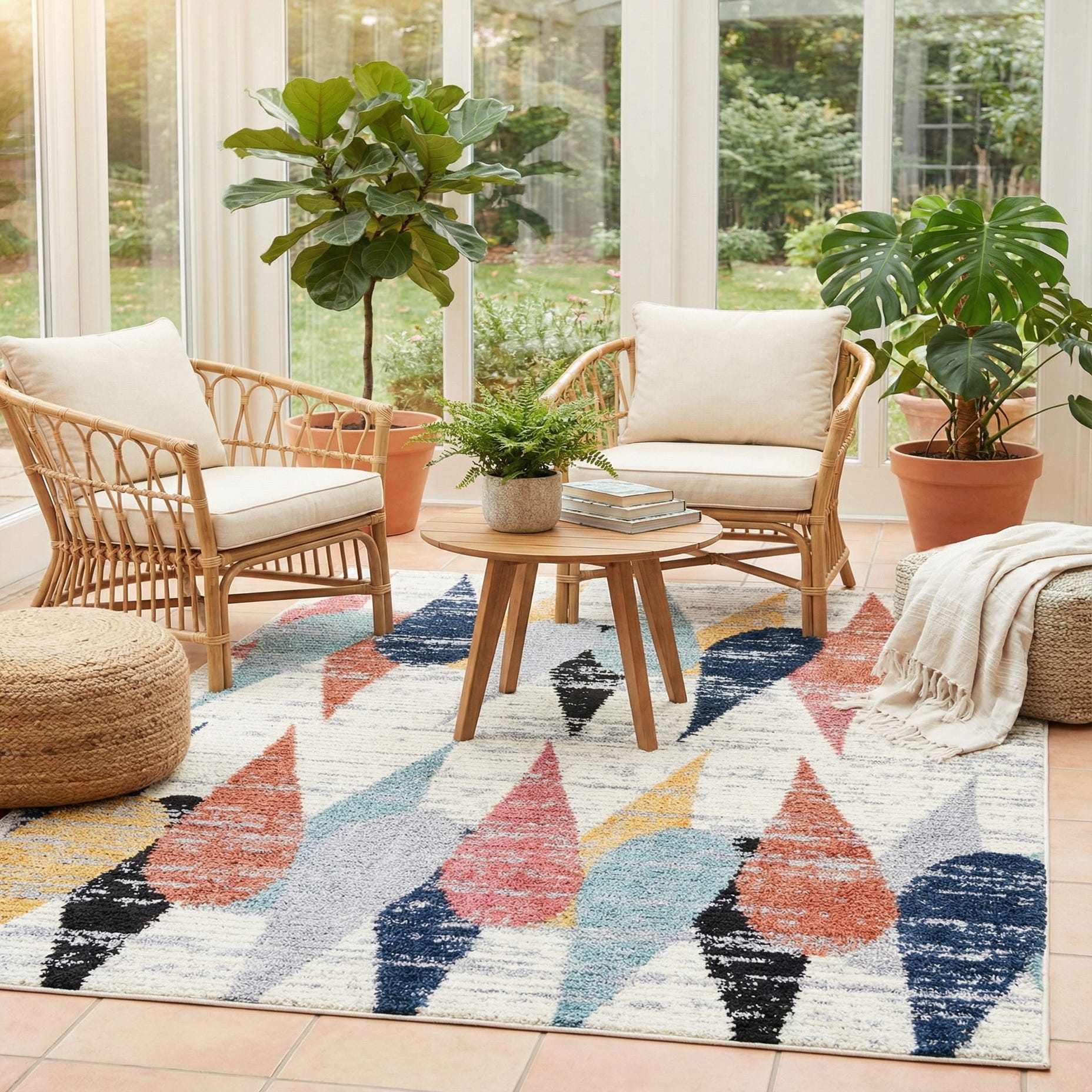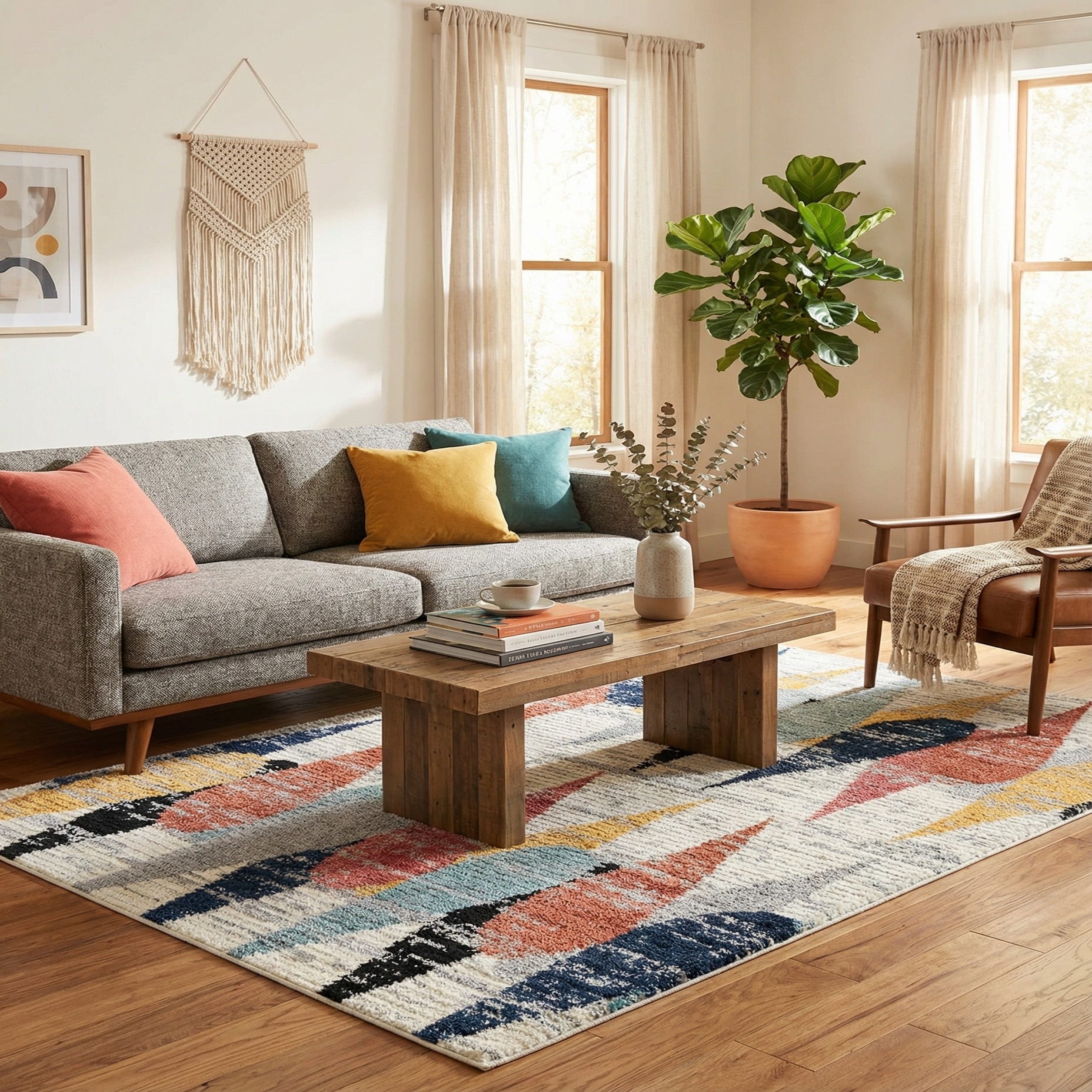 Primary color is Ivory. Colors in this rug include: Ivory, Black, Gray, Light Blue, Navy Blue, Orange, Rust Red.