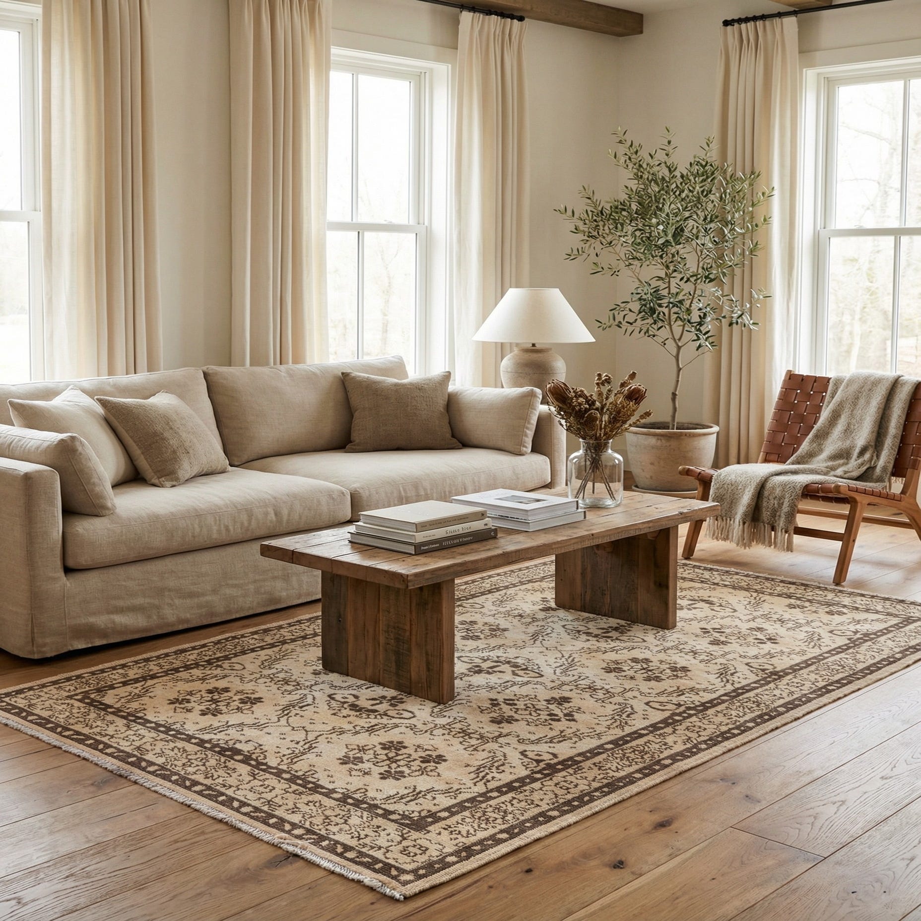 Primary color is Ivory. Colors in this rug include: Ivory, Brown.