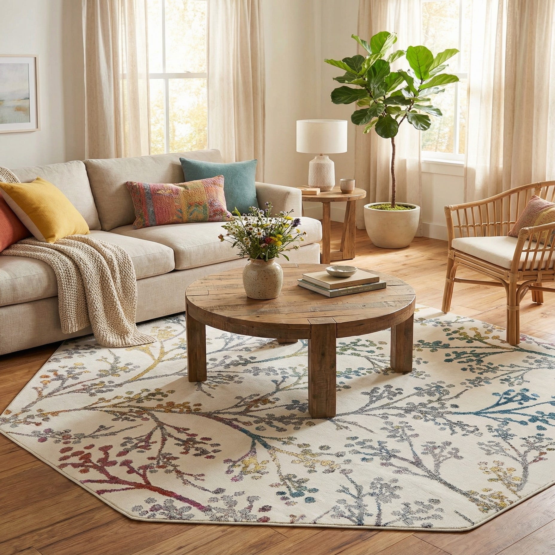 Primary color is Ivory. Colors in this rug include: Ivory, Gray, Navy Blue, Red, Yellow, Pink.