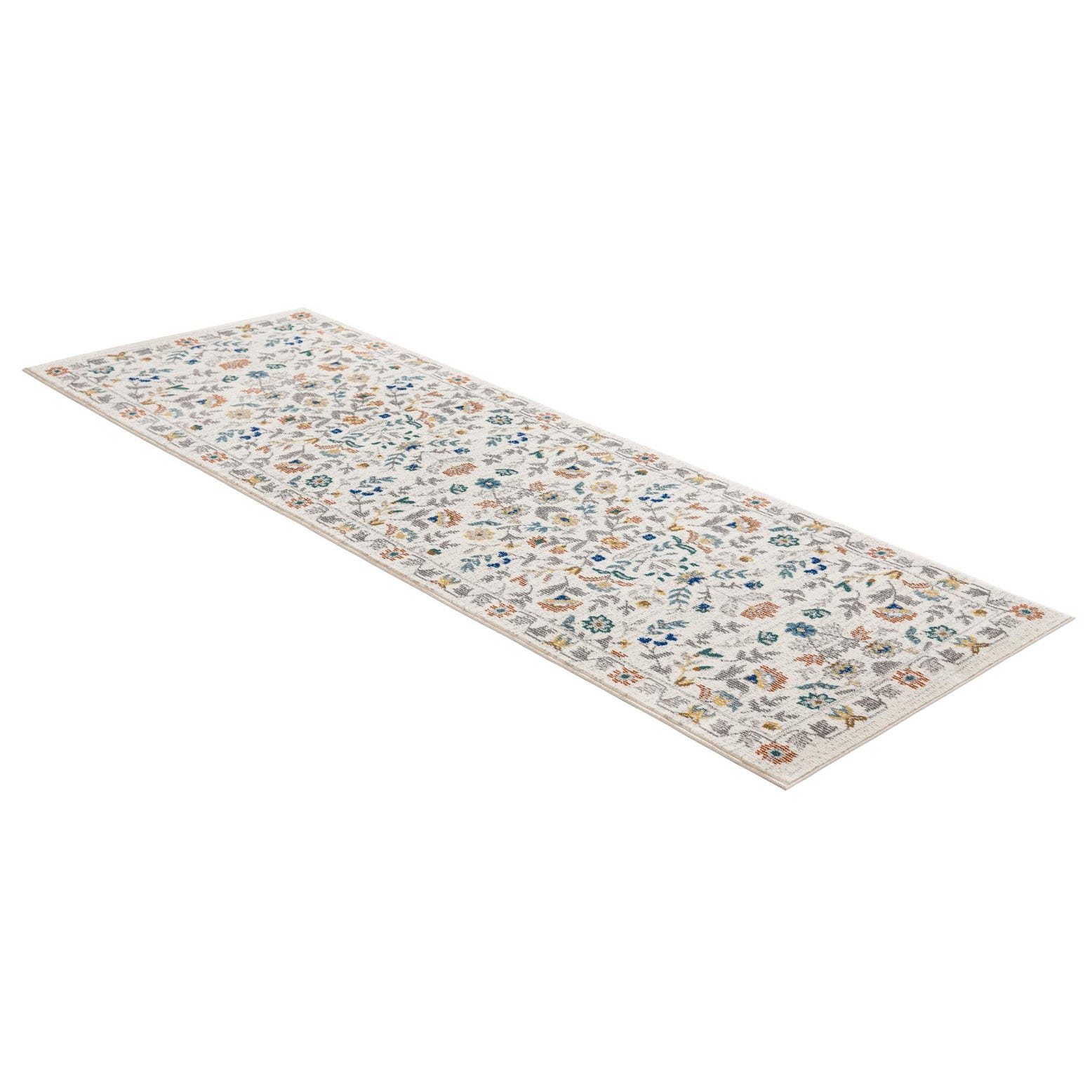 Primary color is Ivory. Colors in this rug include: Ivory, Blue, Gray, Green, Rust Red, Yellow.