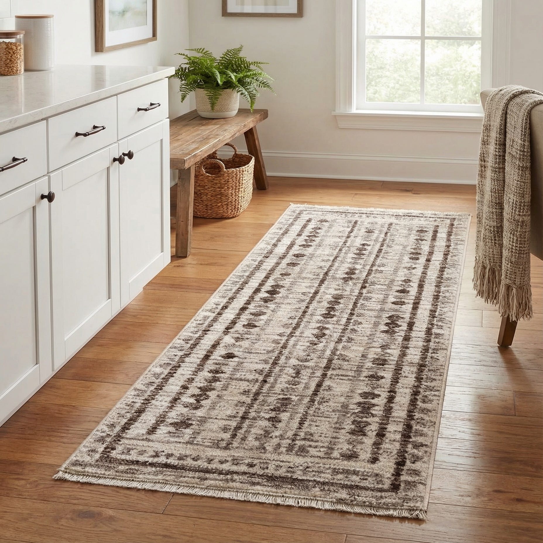 Primary color is Ivory. Colors in this rug include: Ivory, Brown, Gray.