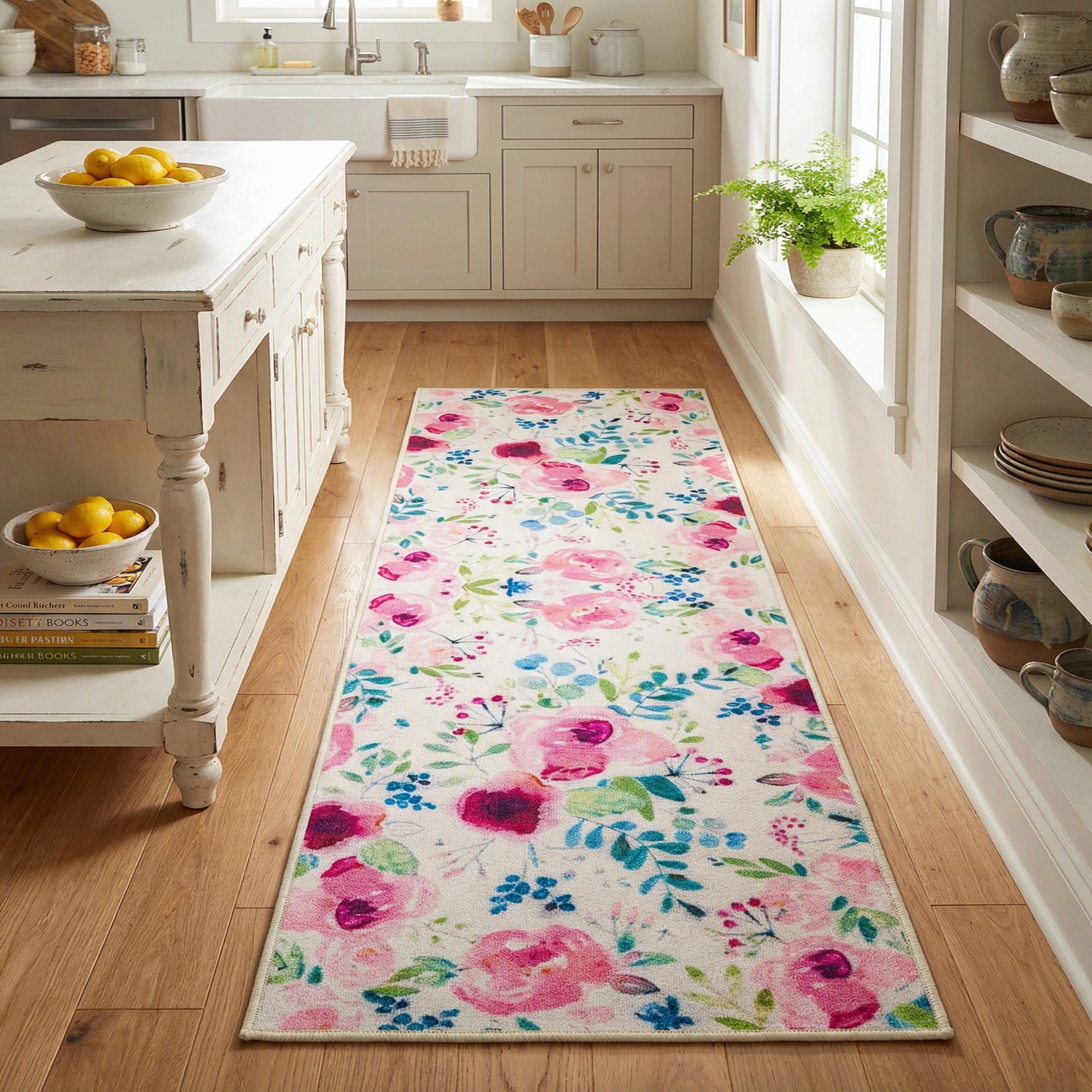 Primary color is Ivory. Colors in this rug include: Ivory, Blue, Burgundy, Green, Pink.