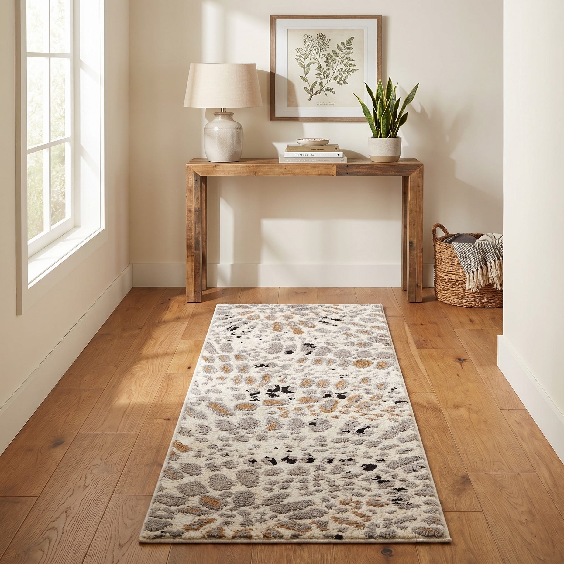 This rug is very soft and the color scheme is excellent! It has grey tan white and off white which makes it a great choice to match your color scheme. I highly recommend. I am considering purchasing another one for another room in my house.