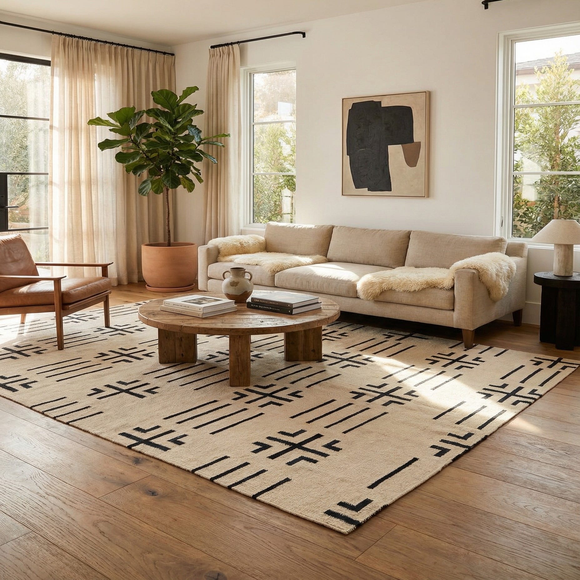 Primary color is Ivory. Colors in this rug include: Ivory, Black.