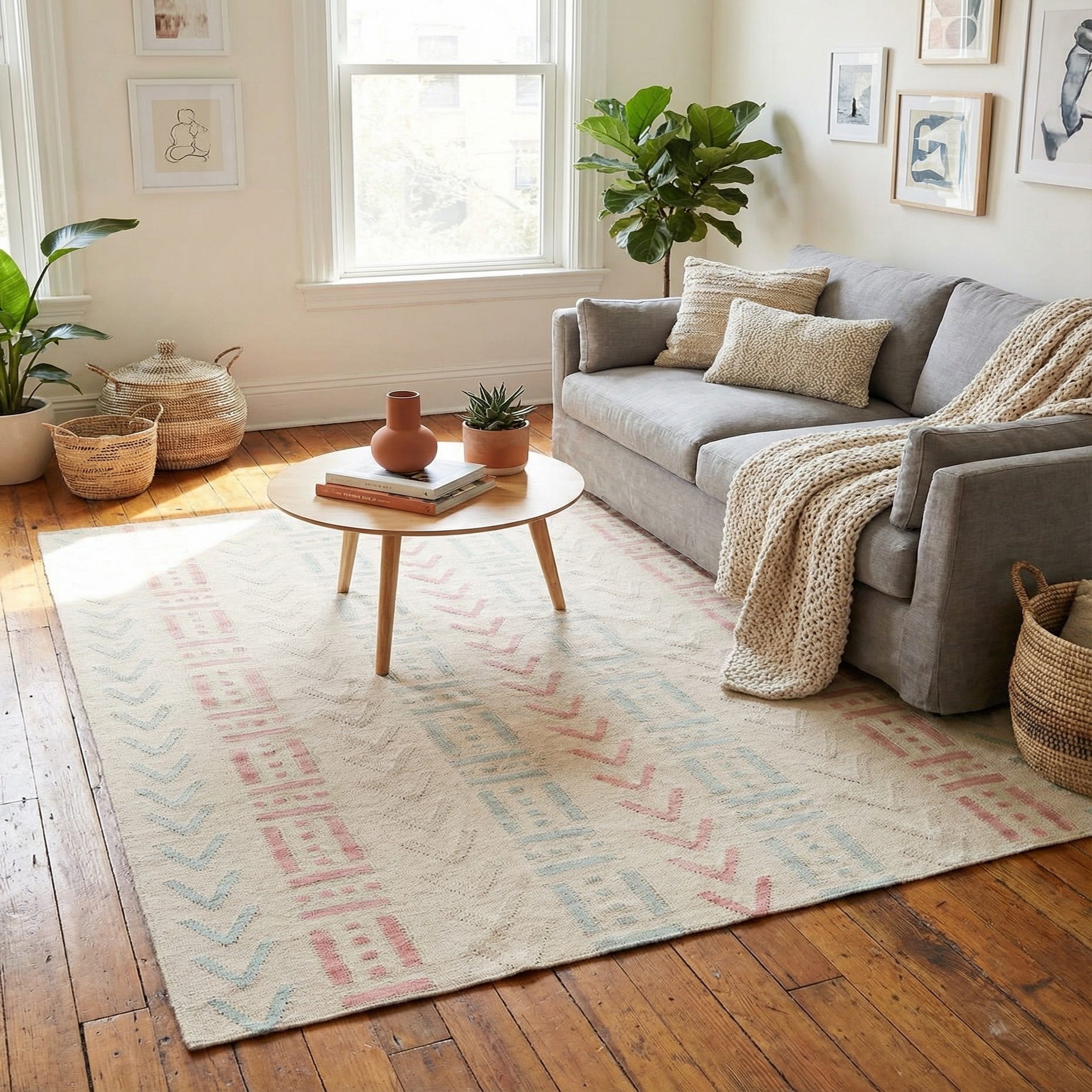 Primary color is Ivory. Colors in this rug include: Ivory, Gray, Light Blue, Pink.
