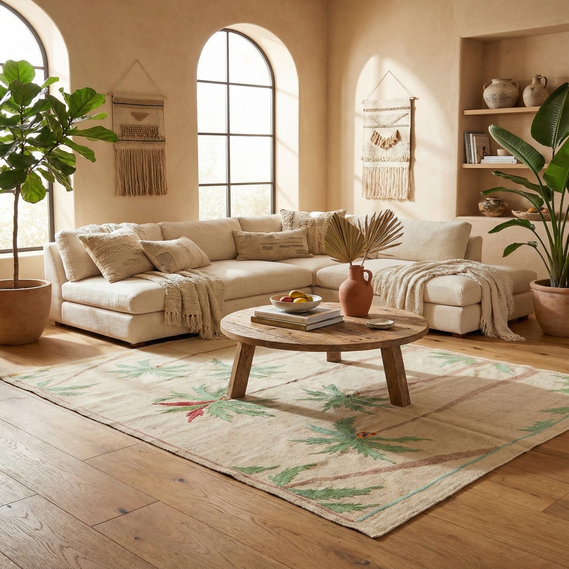 Primary color is Ivory. Colors in this rug include: Ivory, Brown, Green, Red.