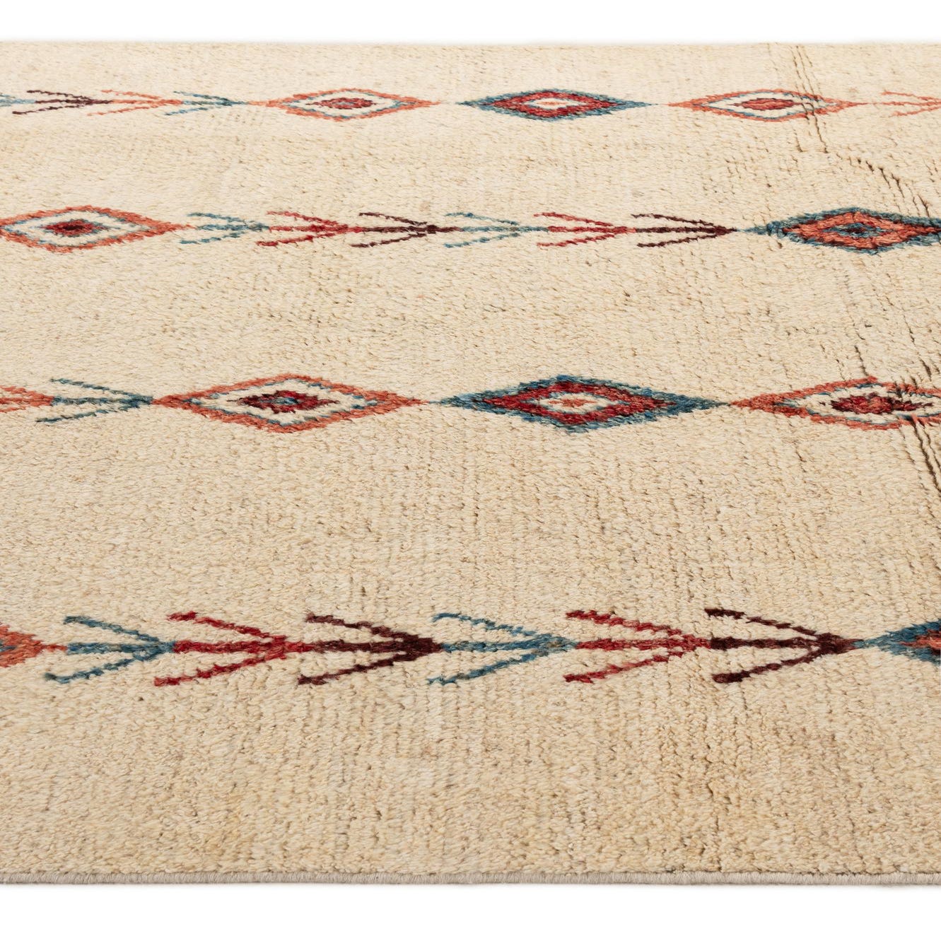 Primary color is Ivory. Colors in this rug include: Ivory, Blue, Red, Burgundy.