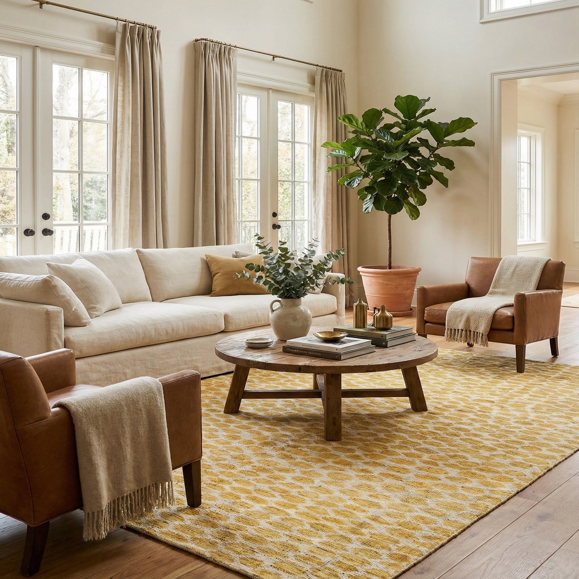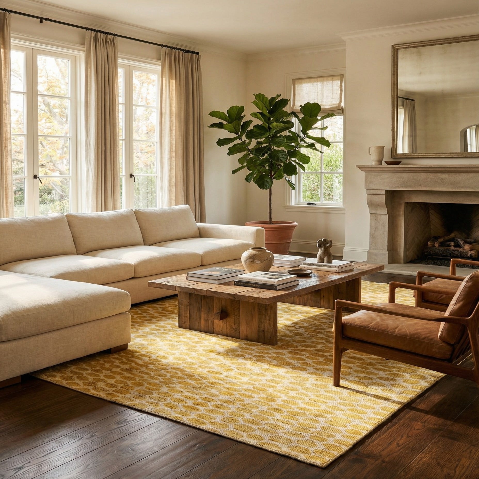 Primary color is Ivory. Colors in this rug include: Ivory, Yellow.