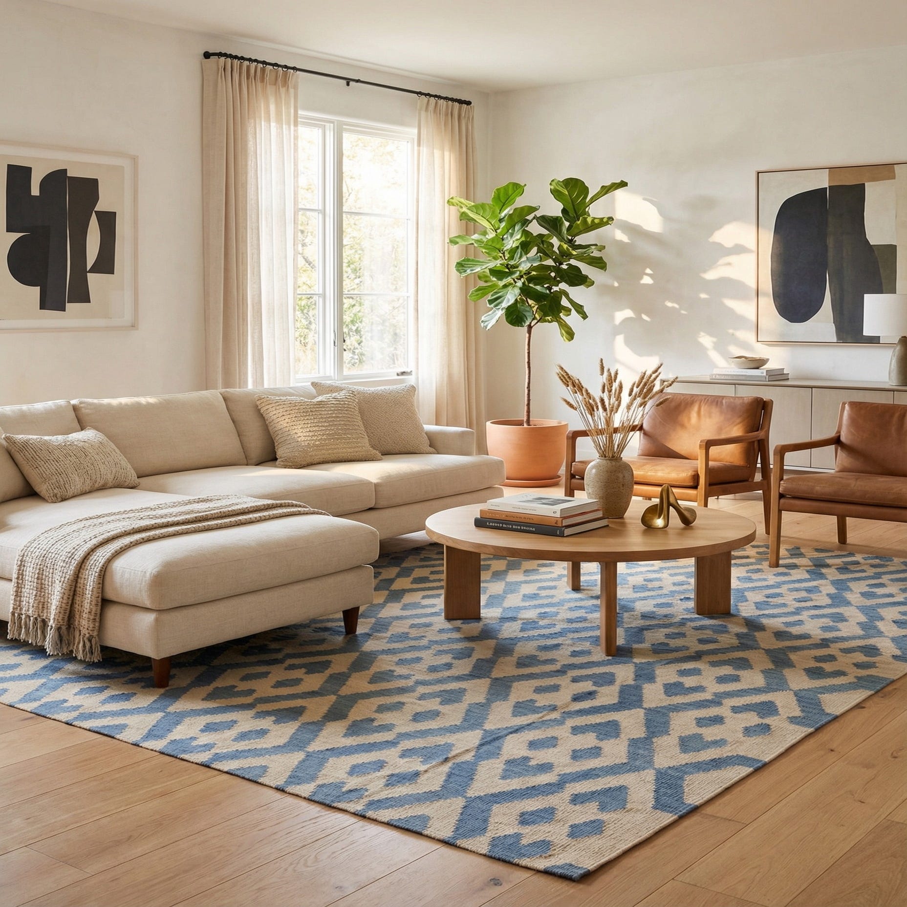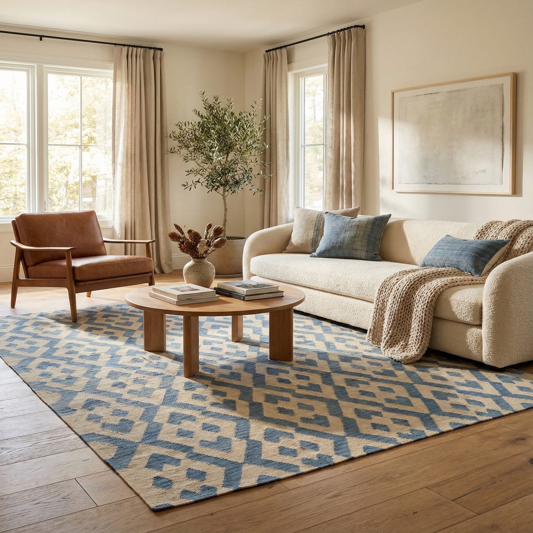 Primary color is Ivory. Colors in this rug include: Ivory, Light Blue.