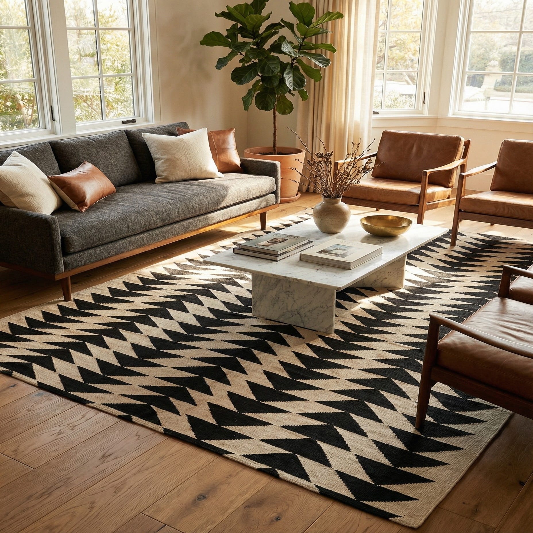 Primary color is Ivory. Colors in this rug include: Ivory, Black.