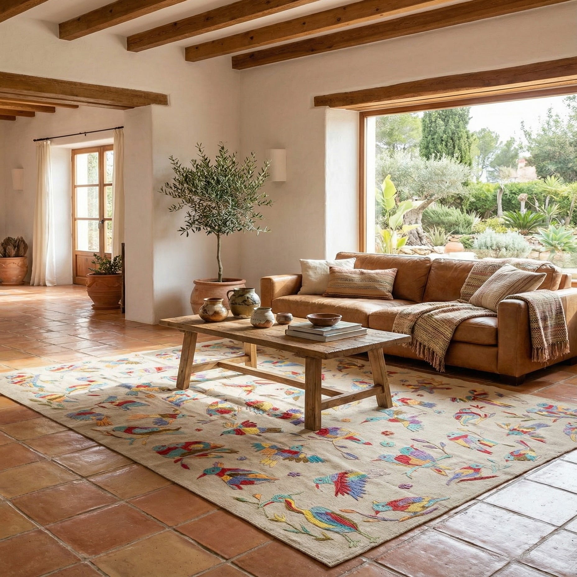 Primary color is Ivory. Colors in this rug include: Ivory, Blue, Olive, Red, Yellow, Turquoise, Violet.