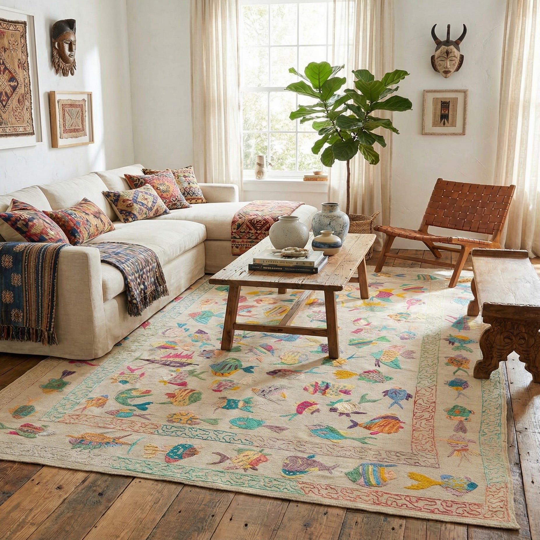 Primary color is Ivory. Colors in this rug include: Ivory, Beige, Blue, Brown, Burgundy, Light Blue, Light Brown, Light Green, Light Salmon, Yellow, Teal, Terracotta, Turquoise, Olive, Orange.