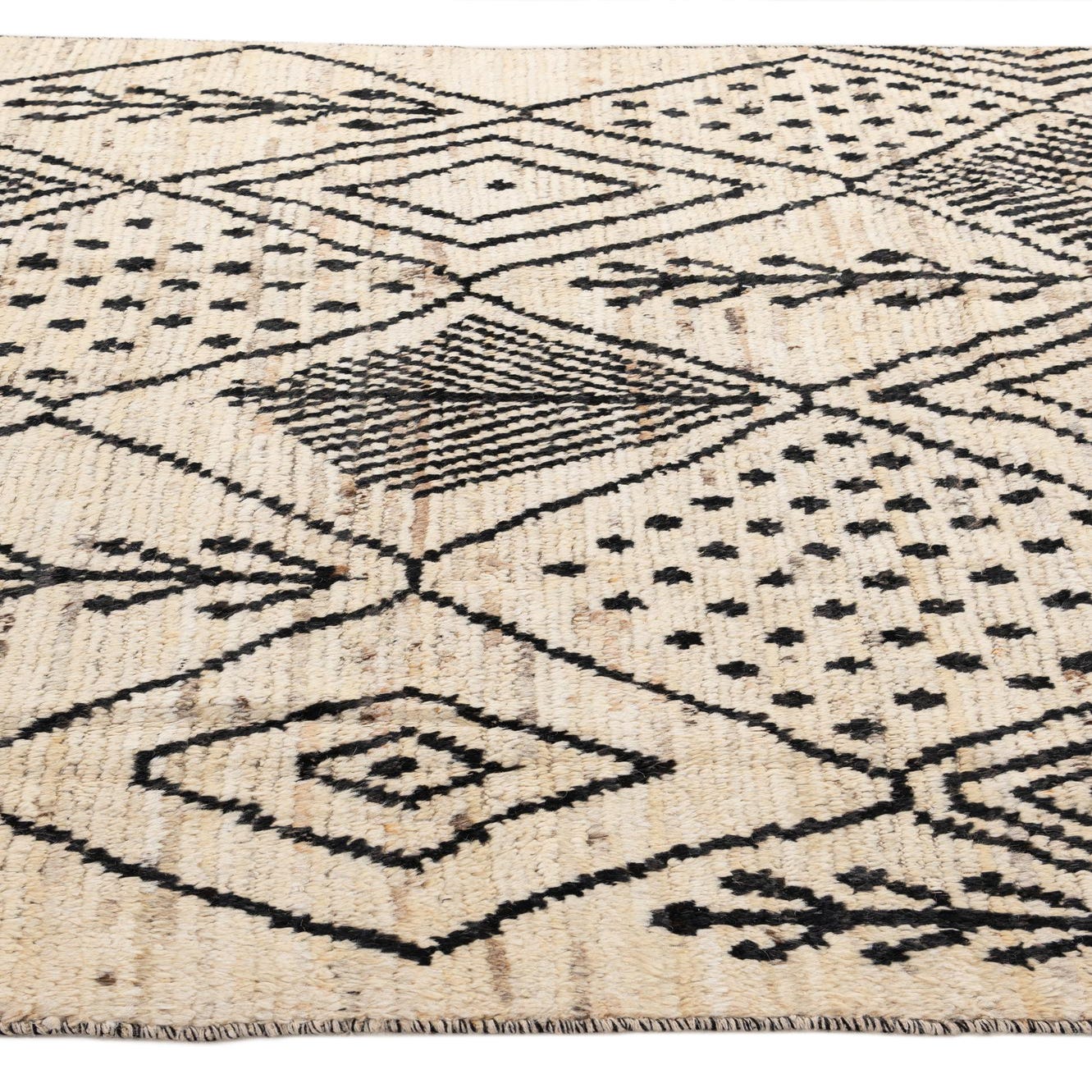 Primary color is Ivory. Colors in this rug include: Ivory, Black, Beige.