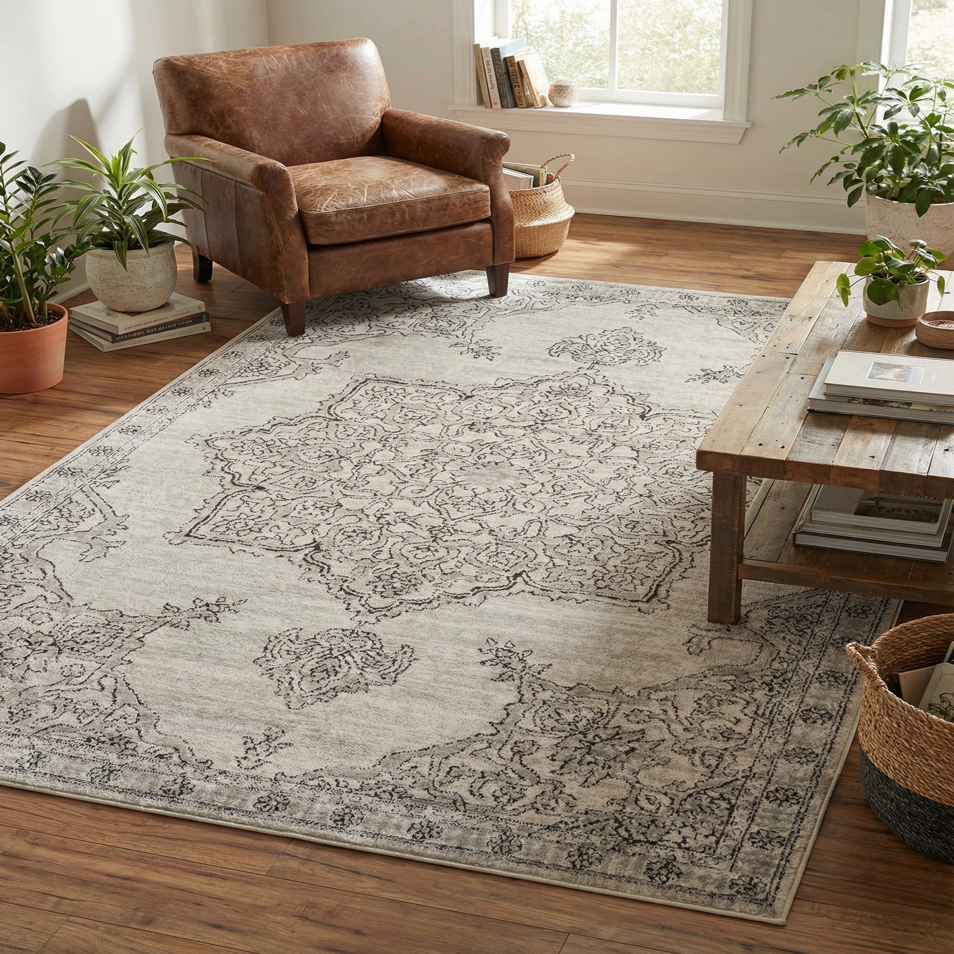 Primary color is Ivory. Colors in this rug include: Ivory, Black, Gray.
