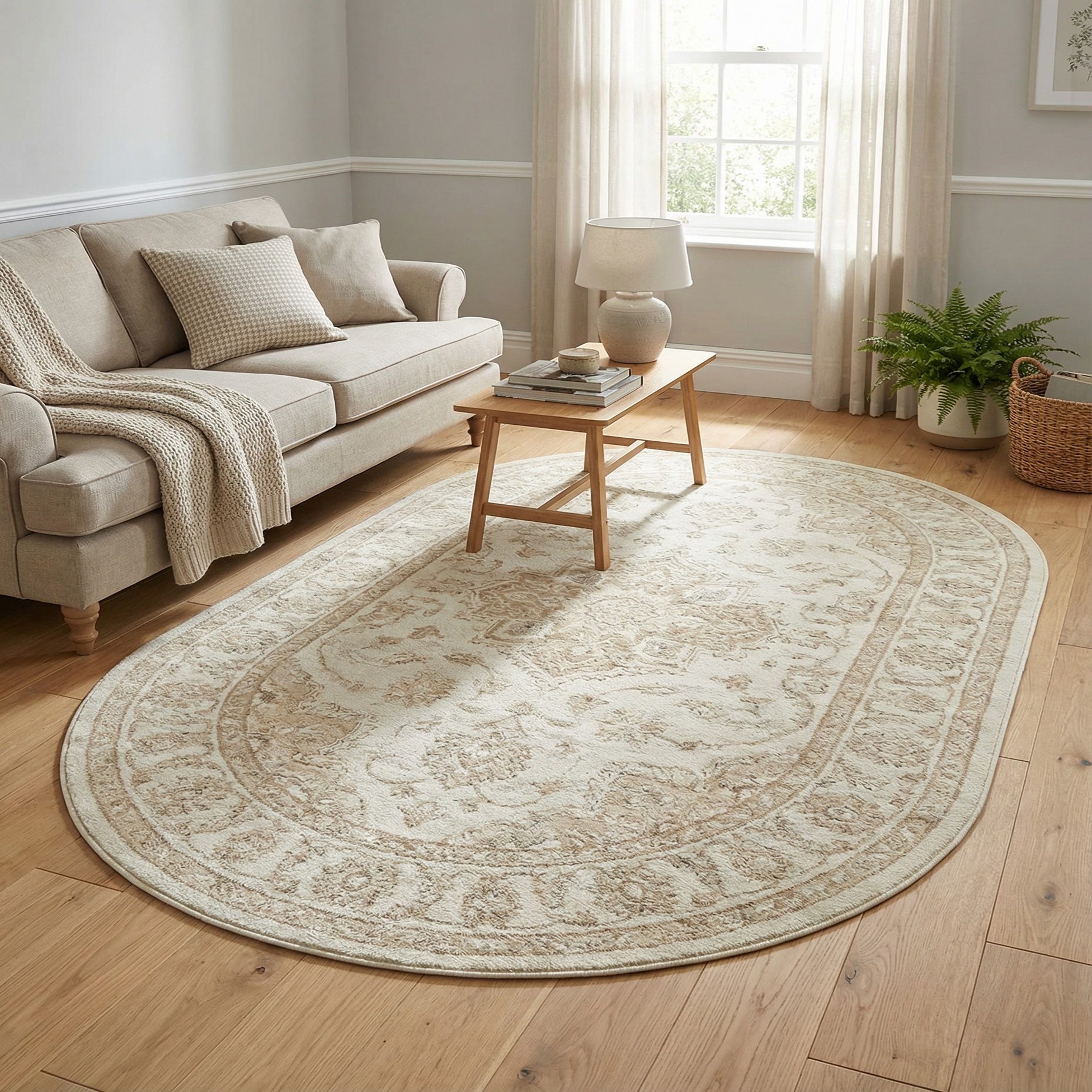 I purchased this rug for the dining room about a month ago - absolutely gorgeous so pleased. It is predominantly off white with gray/silver tones the pattern is subtle. Truthfully our home style of furnishing is traditional/transitional and this rug/pattern is perfect. Could be used with any color palette. Because of the size it came folded as opposed to rolled. It took about a week for it to settle down and I had to put heavy items on the creases to calm it down to the floor. It was worth the effort! Great price and arrived quickly. Would order from this company again and again.