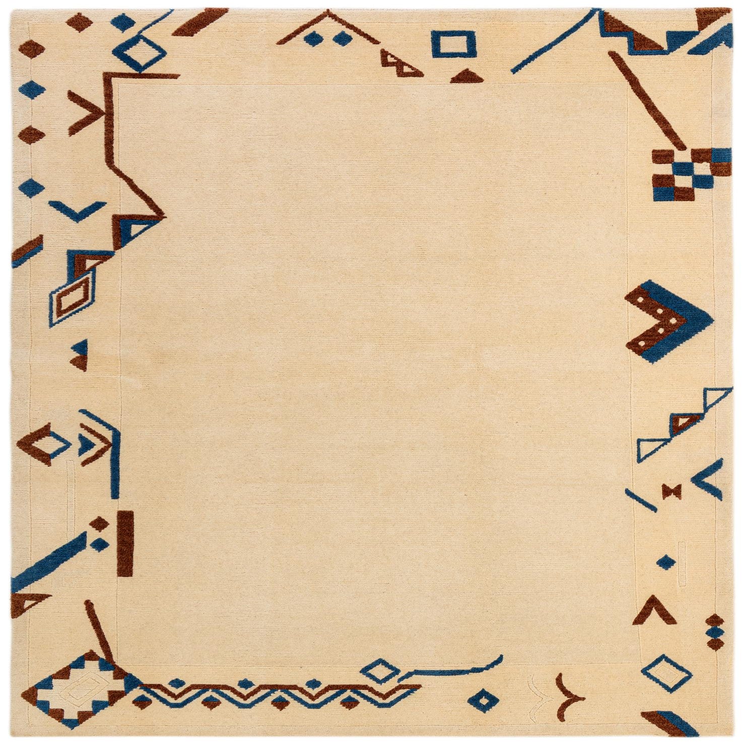 Primary color is Ivory. Colors in this rug include: Ivory, Blue, Brown.