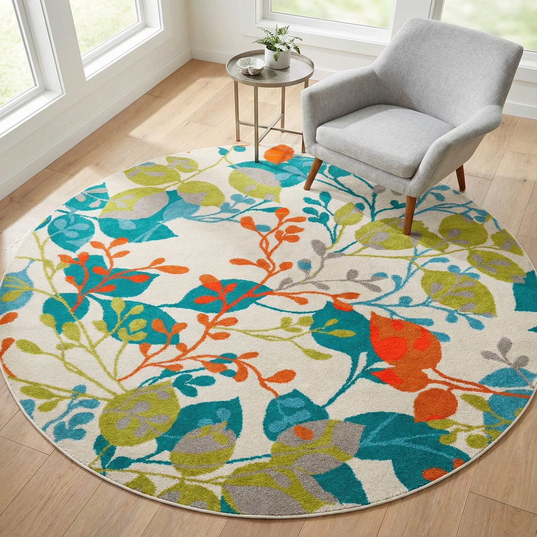 Primary color is Ivory. Colors in this rug include: Ivory, Blue, Gray, Green, Light Blue, Purple, Pink, Orange.
