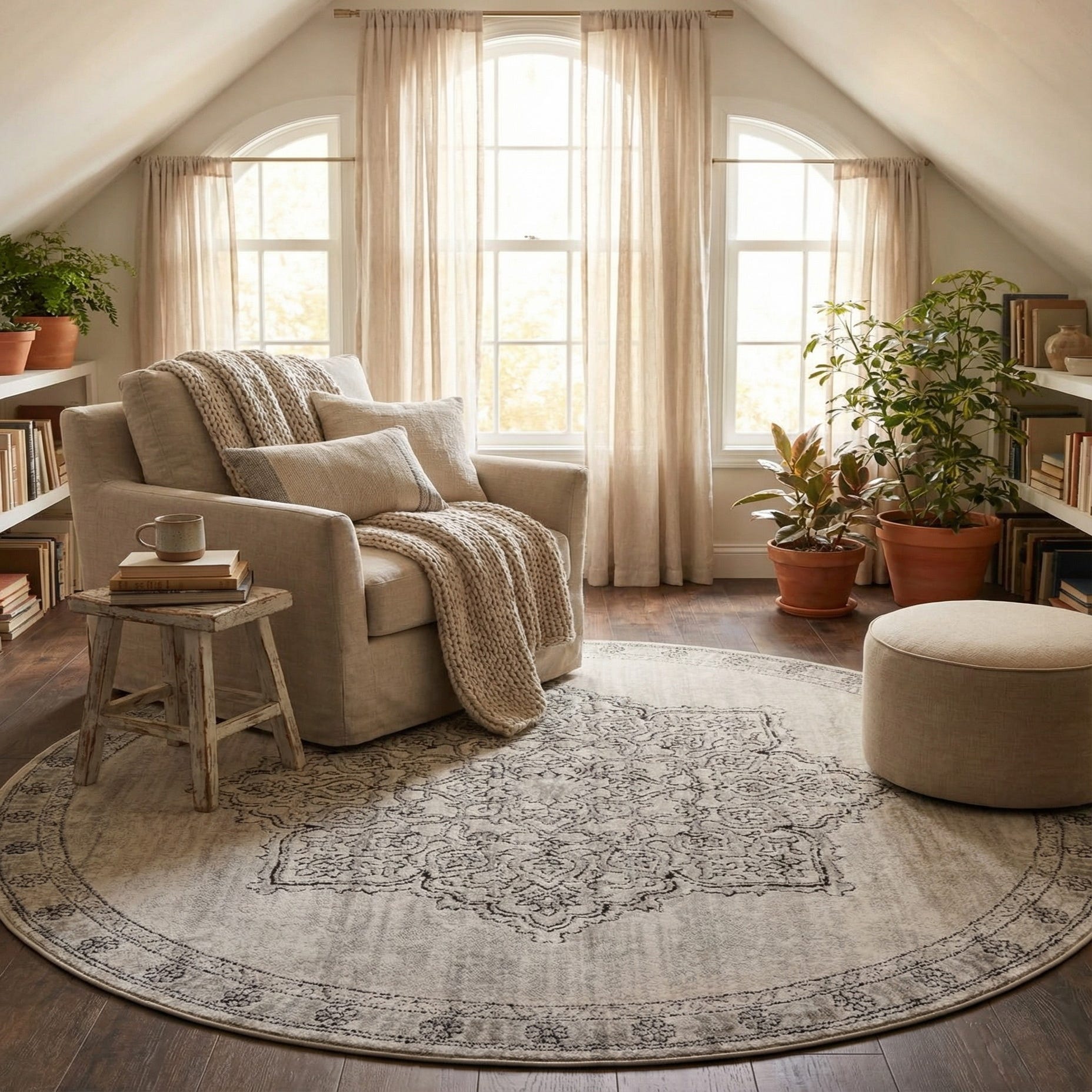Primary color is Ivory. Colors in this rug include: Ivory, Black, Gray.